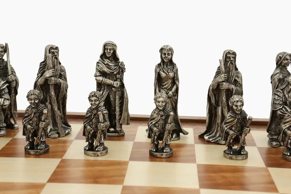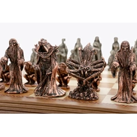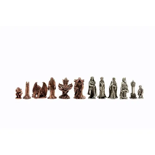 Painstakingly designed and cast in metal, the chessmen feature an intricate Evil Ring motif that adds an element of mystique and drama to the game.