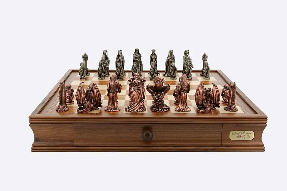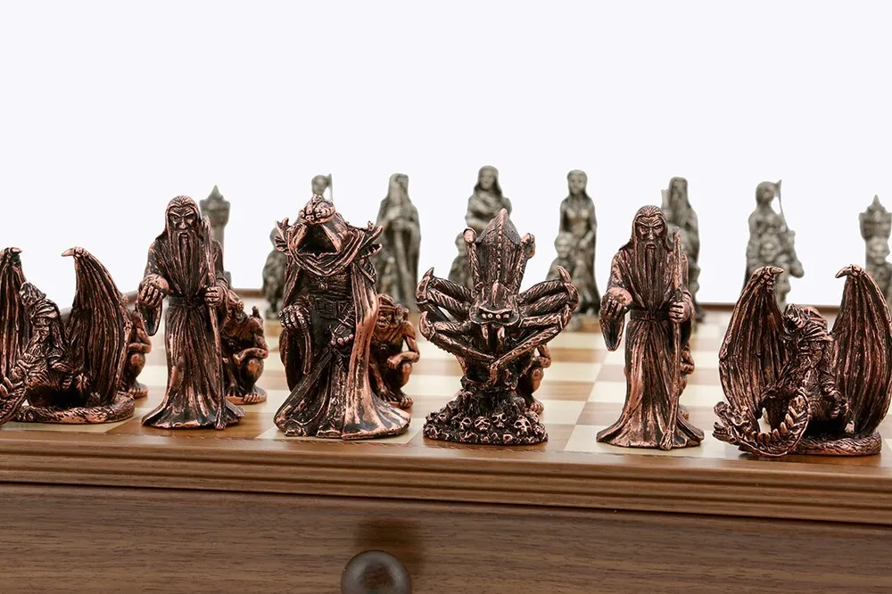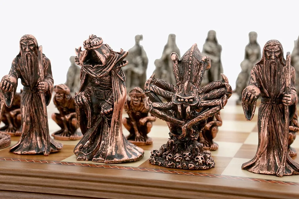 What sets this chess set apart are the Evil Ring Metal Chessmen, each piece a masterpiece in its own right.