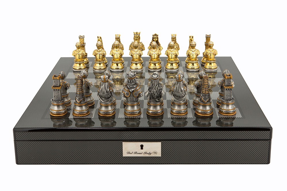 Dal Rossi Italy Medieval Warrior Chess Set on Carbon Fibre Shiny Finish Chess Box 20" with compartments (L2228DR & L2266DR)