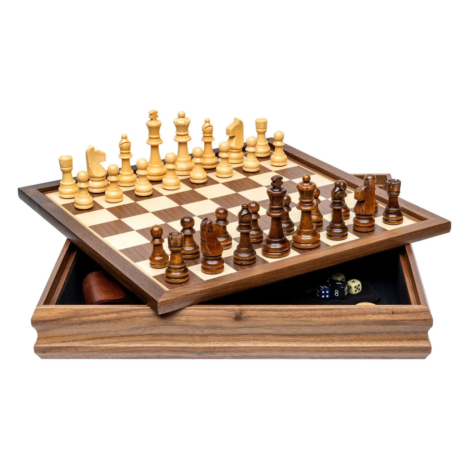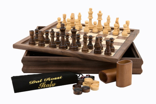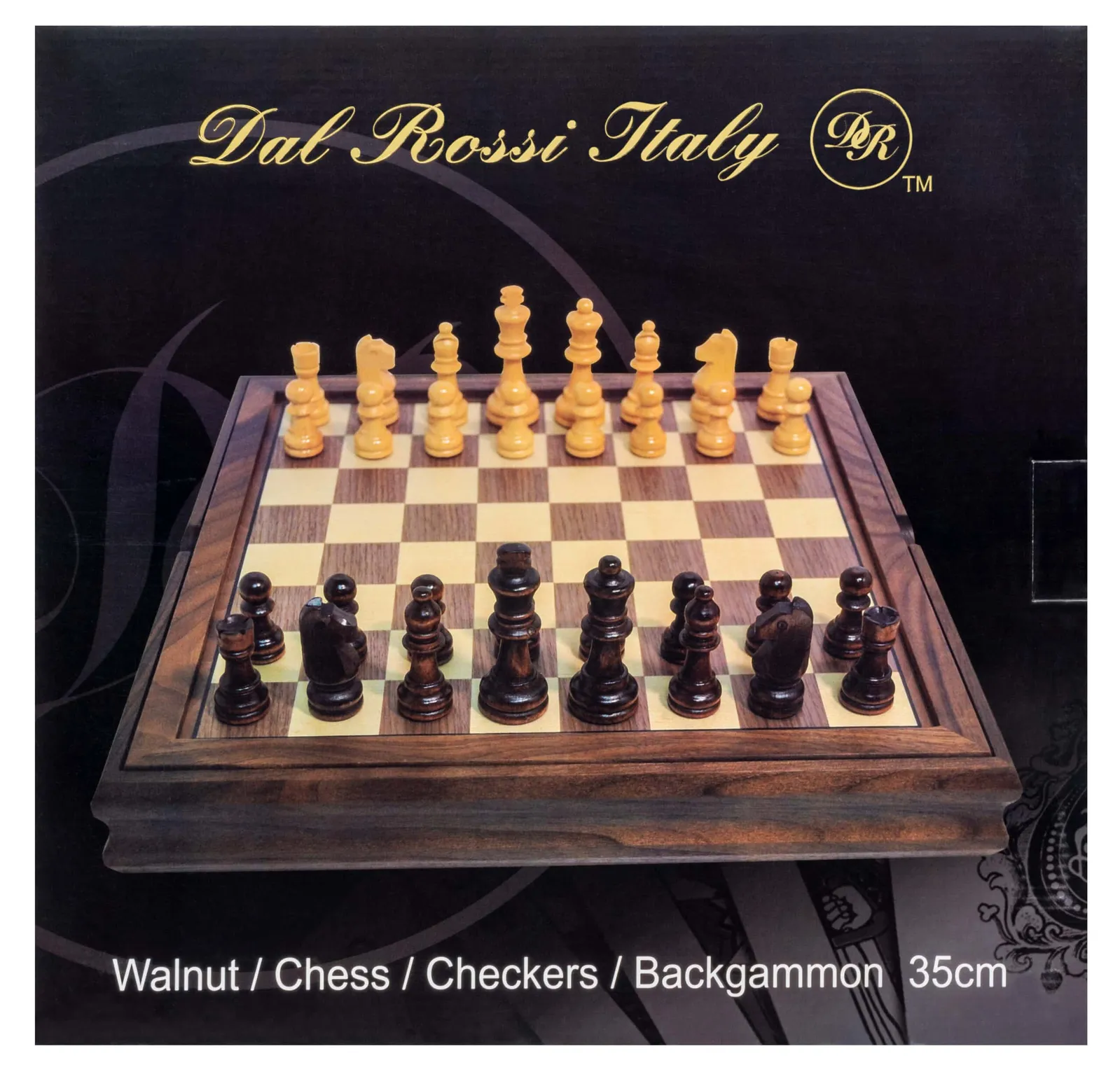 Play up to 3 classic games on a walnut finish Dal Rossi chess, checkers and Backgammon set that easily packs away when not in use.