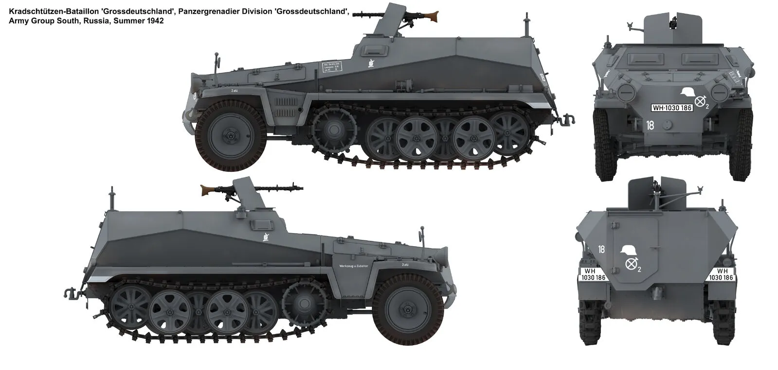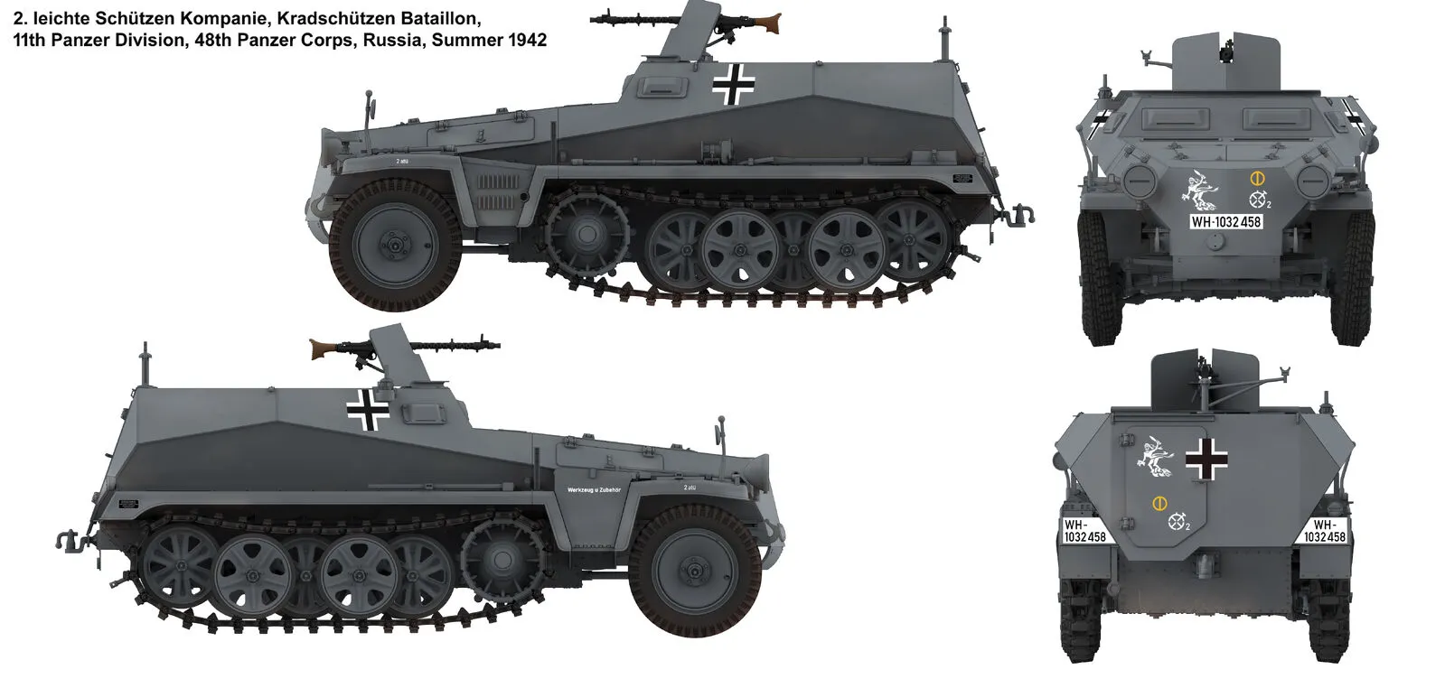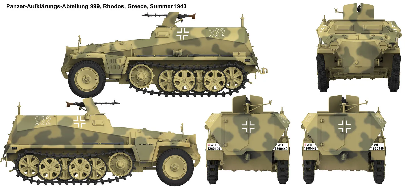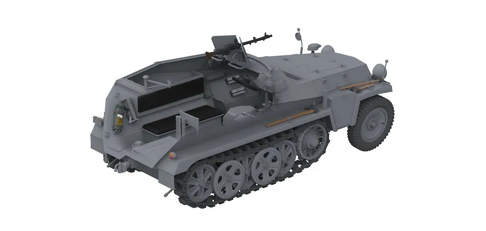 The Sd.Kfz.250 is the official designation for the German light armored personnel carrier developed based on a 1t half-track during World War II. The Sd.Kfz.250/1 variant is designed to transport 4 personnel.
