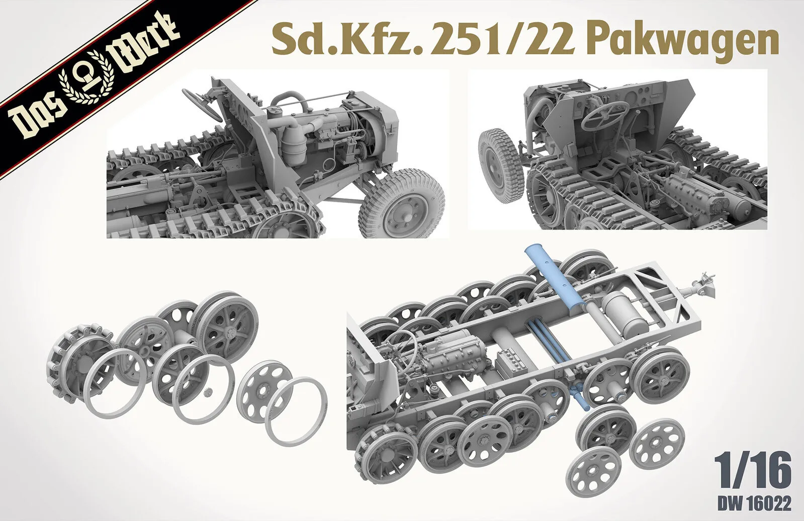 SKU: DWK16022 | Brand: DasWerk | Product: Das Werk 1/16 Sd.Kfz.251/22 Ausf.d "Pakwagen" Plastic Model Kit The Sd.Kfz. 251/22 Ausf.D PAKwagen was a German WWII half-track vehicle fitted with a 7.5 cm Pak 40 anti-tank gun. The design combined the chassis mobility and armor protection of the half-track platform with mobile anti-tank firepower for battlefield support operations. Specifications - Single-link functional track system - Clear transparent components - Torsion bar suspension with detailed running gear replicating original design - Removable floor armor segments attachable to chassis - Precision gearshift and gearbox assembly - Detailed brake system and fuel system components - Articulating front axle with steering angle representation - Precision cooling and exhaust system detailing - Engine compartment with removable cover plates - Detailed engine bulkhead, instrument panel, and radio equipment - Articulated hatches and armament mounting - Individual floor plate segments for interior viewing - Multi-segment armor construction with authentic weld simulation