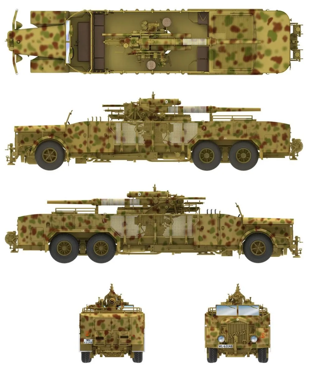 SKU: DWK35024 | Brand: DasWerk | Product: Das Werk 1/35 8,8 cm Flak on a 9t VOMAG Plastic Model Kit [DW35024] This Das Werk 1/35 scale model represents the 8.8 cm anti-aircraft gun mounted on a VOMAG chassis—a purpose-built configuration that saw limited production, with approximately 20 units documented in photographs from 1941 onward. A typical battery formation consisted of four gun carriages, two measuring vehicles, and one support vehicle. The kit features newly developed molds for both the vehicle and 8.8 cm Flak components. Construction options include driving or firing positions, with an adjustable anti-aircraft gun capable of height and lateral movement. The model includes a complete interior with detailed engine, optional removable engine cover plate, full ammunition frames and grenades, etched PE parts, checker plate floor patterns, and buildable ammunition racks and storage boxes that open or close. Injection-molded wheels, authentic VOMAG markings, and transparent components complete the assembly. Four historically researched decal options are provided, including Budapest and Halasz Ba markings.