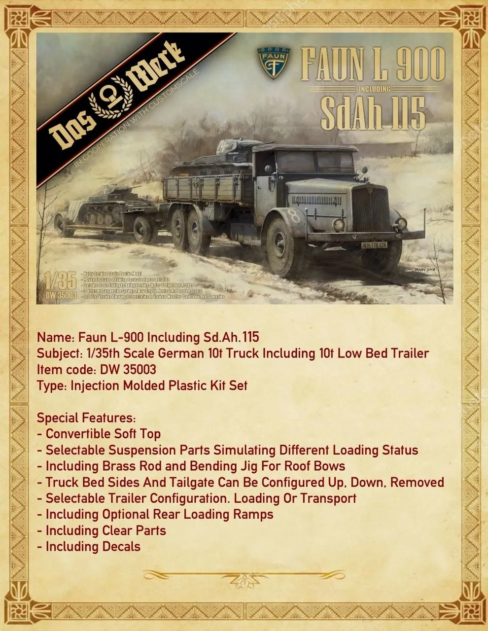 SKU: DWK35003X | Brand: DasWerk | Product: Das Werk 1/35 Faun L900 incl. Sd.Ah.115 Plastic Model Kit This 1/35 scale plastic model kit pairs a Faun L900 truck with an Sd.Ah.115 trailer, combining three loadable cargo states, a functional tail lift, and switchable door configurations. A Sprigel assembly guide with metal profiles aids construction. The trailer includes a detachable rear axle and mobile loading ramps. Total length when assembled reaches approximately 56 cm. Created through partnership with Customscale and decal specialist Uschi van der Rosten. Assembly, paints, and adhesive are not included.