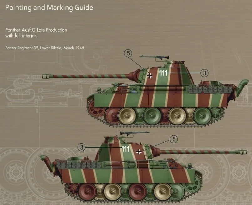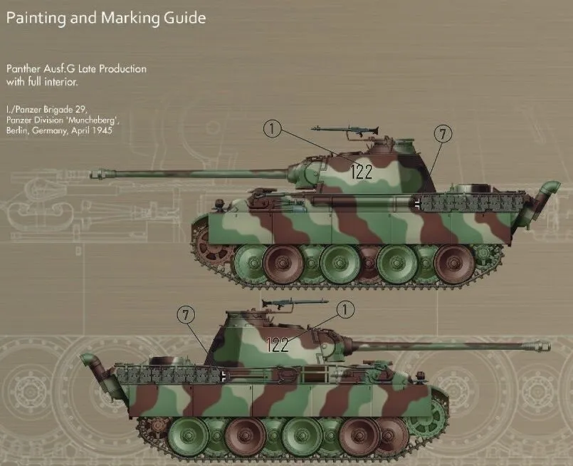 The Panzerkampfwagen V Panther (Ausführung G) was a medium German Wehrmacht tank produced from March 1944 to April 1945 by M.N.H., Daimler-Benz, and MAN, with a total of 2,953 units built.
