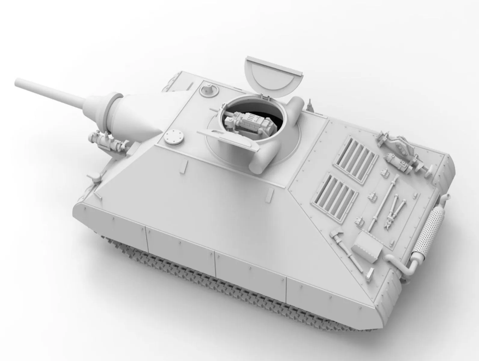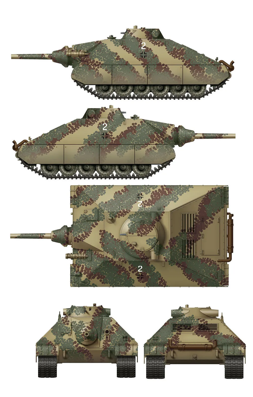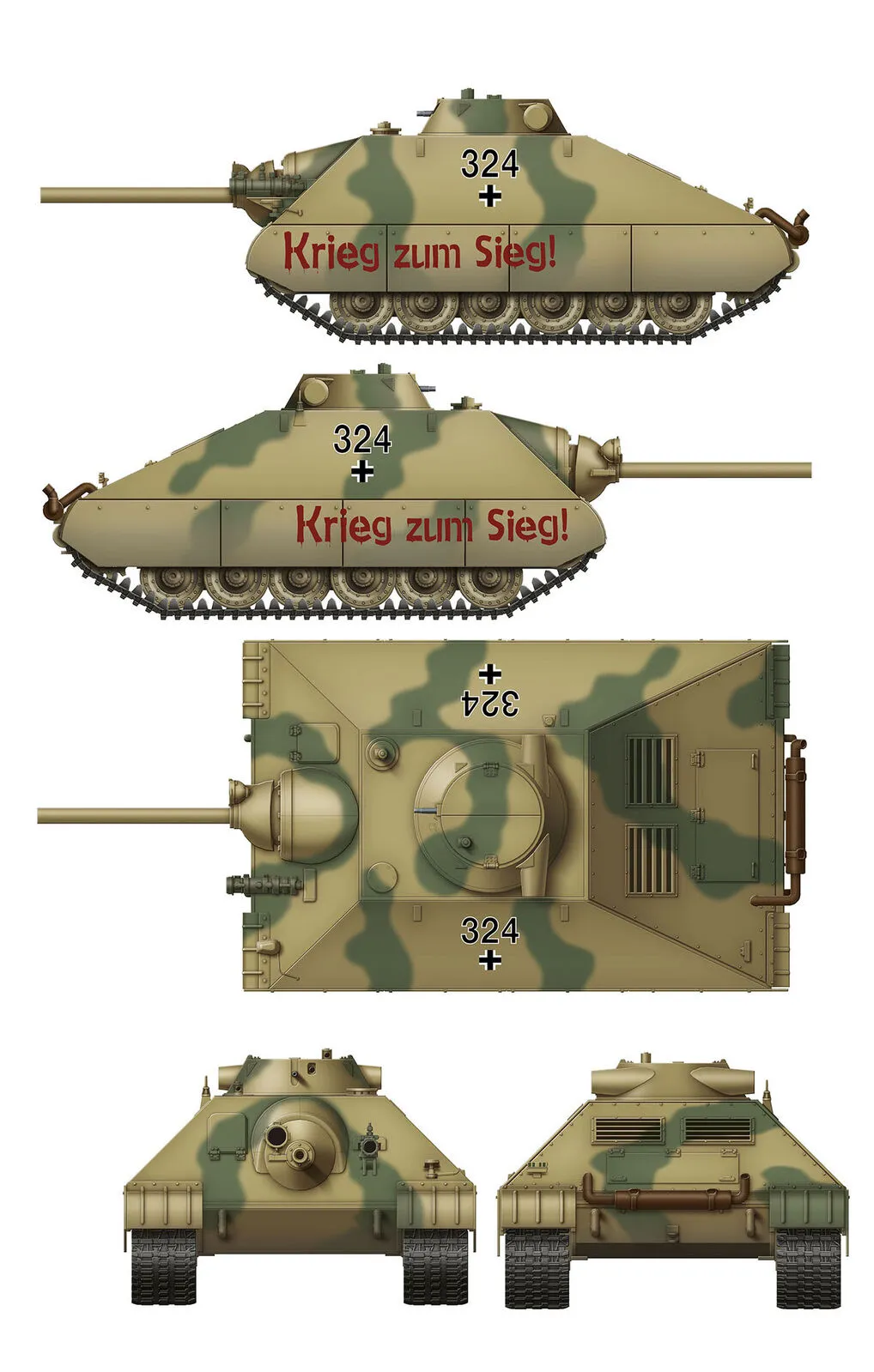 This tank destroyer is something like the heavily armored cousin of the German Hetzer. Weighing in at approximately at 30 tons, this vehicle should effectively destroy enemy tanks.The project did not progress beyond the concept phase and was never built for the Wehrmacht.The model is exciting for anyone who would like to build What-If / Wehrmacht 1946 models.With this kit, either the version with the 10,5-cm-leichte Feldhaubitze 43 or the version with the 10cm Panzerabwehrwerfer can be built.The kit includes six different markings: