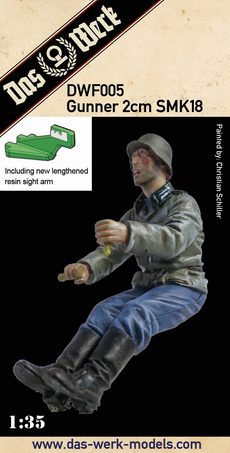 SKU: DWKF005 | Brand: DasWerk | Product: Daswerk F005 1/35 Richtschütze Salvenmaschinenkanone Plastic Model Kit One resin gunner figure for the 2cm SMK 18 Typ 2 (DW35005). Features a lengthened resin sight arm component that replaces the corresponding part in the original gun kit. This is a scale plastic model kit requiring assembly. Paints and adhesive sold separately.