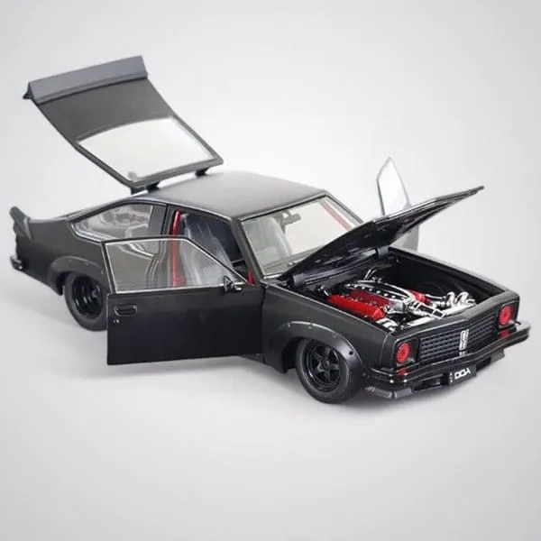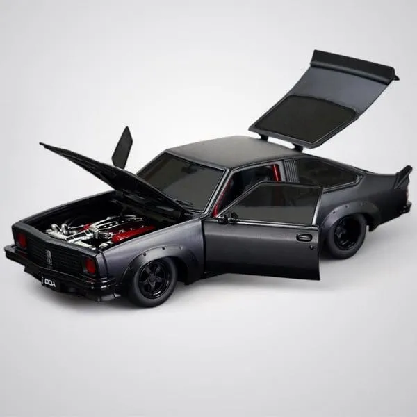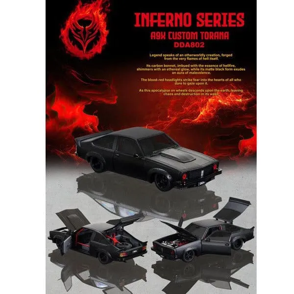 SKU: DDA802 | Brand: Diecast Distributors | Product: DDA 1/24 A9X Twin Turbo LS Torana Custom Low-Profile Wheels Diecast Model Car This 1/24 scale custom A9X Torana features a carbon fibre bonnet, matte black finish, and red headlights. The model includes opening doors, bonnet, and boot with fully detailed interior and LS6 twin-turbo engine. Low-profile wheels complete the custom specification. Part of the Inferno Series with a limited production run of 840 units.
