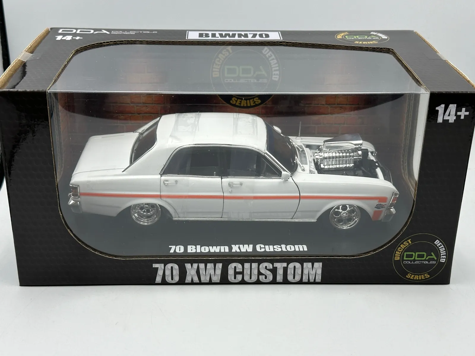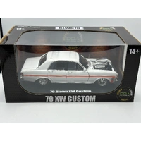 Scale : 1:24 - Make/Model : Ford XW Falcon GT-HO - Details: Supercharged and Slammed - Colour: White w/Orange Stripes - Manufacturer : DDA Collectibles
