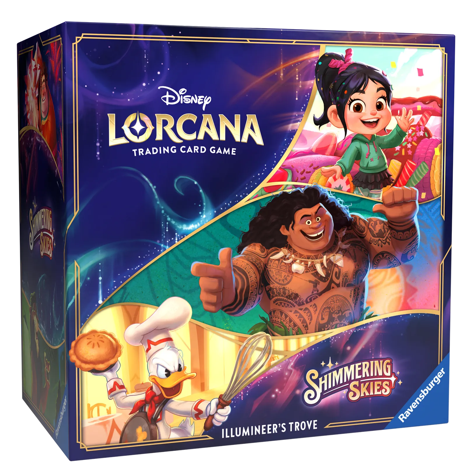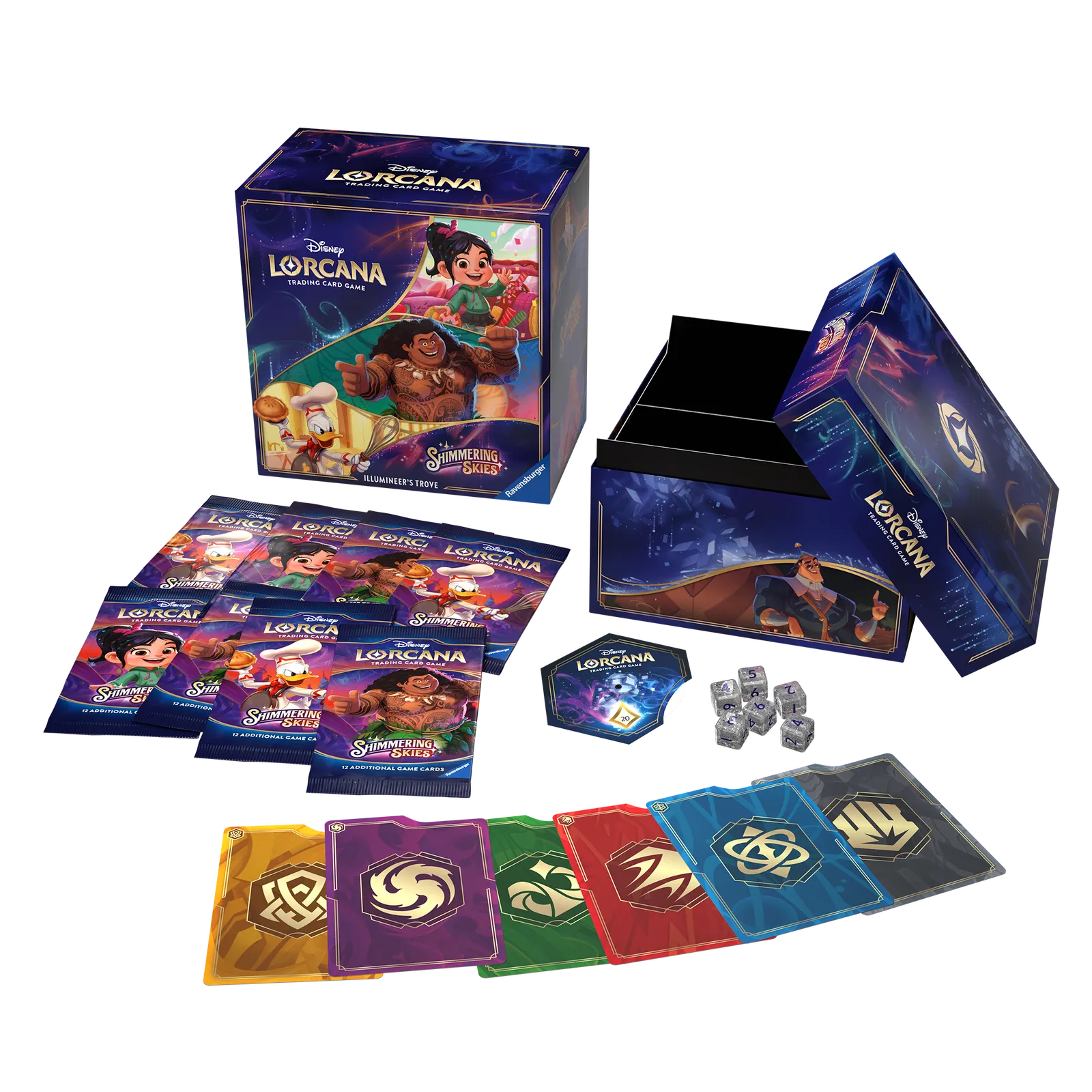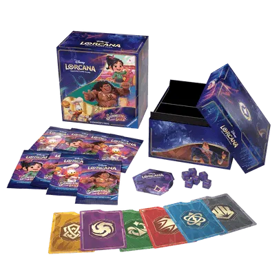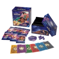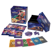 Bringing together Disney’s century of storytelling experience and Ravensburger’s 140 years of games excellence, Disney Lorcana is the world’s most welcoming trading card game (TCG) and the ultimate Disney collectible. Here, players become “Illumineers” and wield magical inks to summon a team of Disney characters known as glimmers, who appear in both familiar and fantastical ways. Players explore the realm of Lorcana alongside their teams of glimmers as they race to be the first to collect 20 “lore.” In each game, players will play characters, items, locations, and actions – including songs – from their hands and choose whether to have their characters “quest” for lore or challenge opponents to slow them down. In Shimmering Skies, the realm of Lorcana holds a great festival to celebrate its recent victory over Ursula, achieved in the previous set, Ursula's Return. While most of Lorcana participates in the vibrant, fun-filled activities, a new mystery begins as our Illumineers search for a way to repair the worsening damage the Ursula glimmer caused to the Great Illuminary. The ultimate treasure for both collectors and players, the Illumineer's Trove contains a full-art storage box with six ink-themed card dividers to keep your Disney Lorcana TCG cards safe and organised by ink.