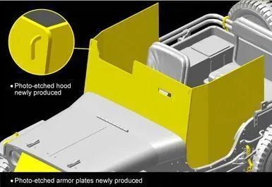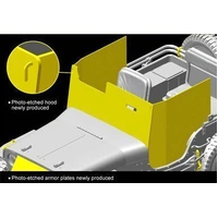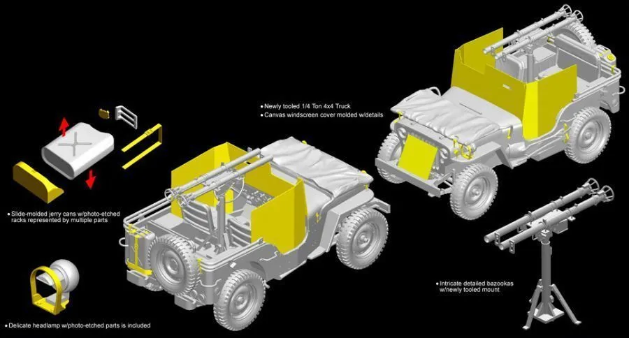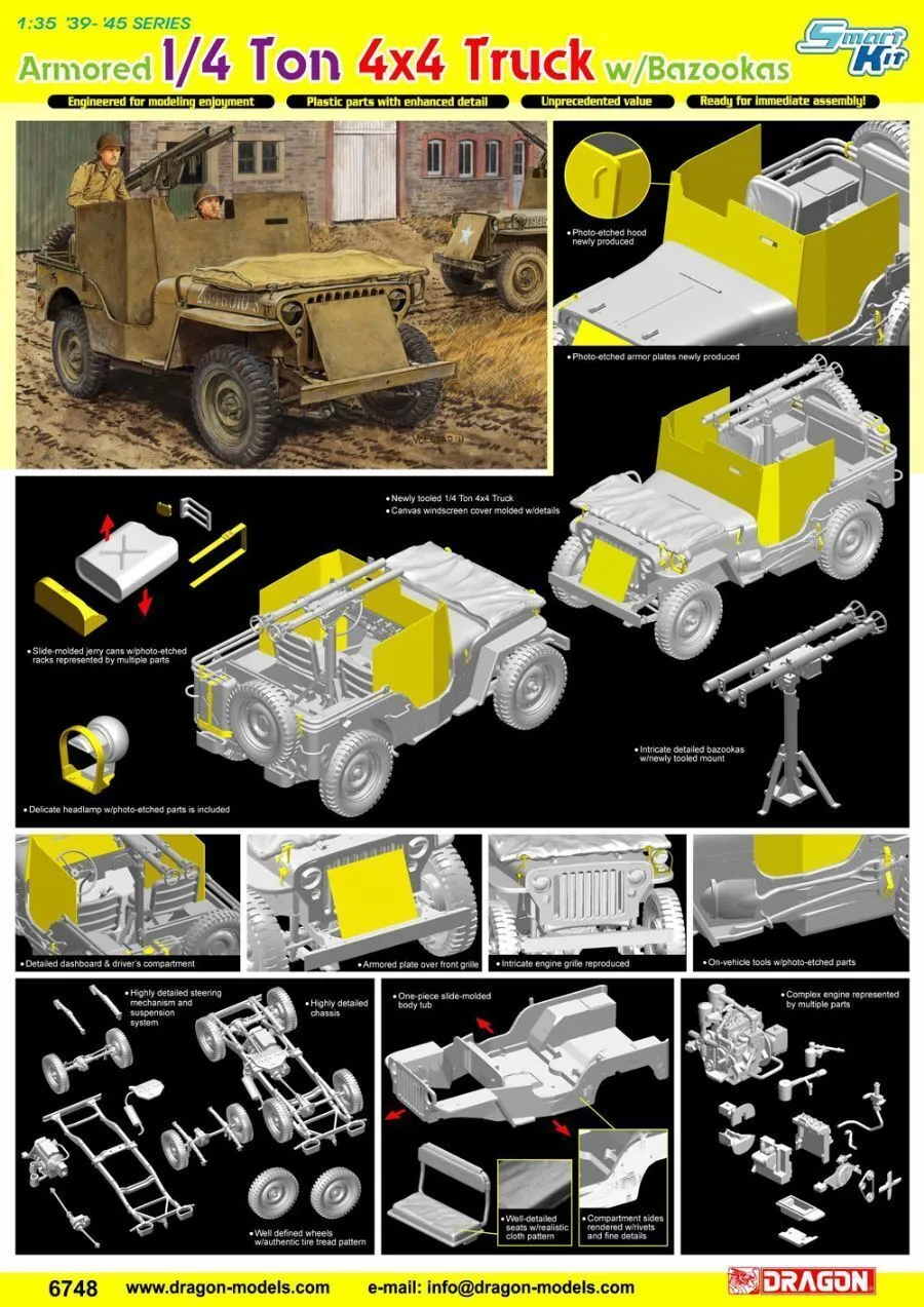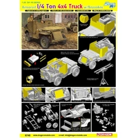 Following a very popular earlier release (Item No.6714), Dragon has produced another exciting 1/35 scale kit of a 1/4-Ton Armored 4x4 Truck. The difference is that it carries two bazookas instead of the original kit...s .50-cal machine gun. The twin bazookas are fitted on a pintle mount that...s newly tooled especially for this release. Such an improvised weapon installation was observed on scout jeeps during the Battle of the Bulge, for example. The vehicle features a solid one-piece body tub for accurate assembly and alignment. Under the hood is an extremely realistic-looking engine that assembles from multiple parts; it can be shown off if the modeler chooses to model the hood up. Atop the hood, the windscreen is depicted wrapped in a canvas cover. The new armor plates are rendered in photo-etched metal to give a true-to-scale appearance, while other metal components provide items such as tool mounting brackets, hood retainers and various straps. All in all, this is one extremely potent little vehicle!