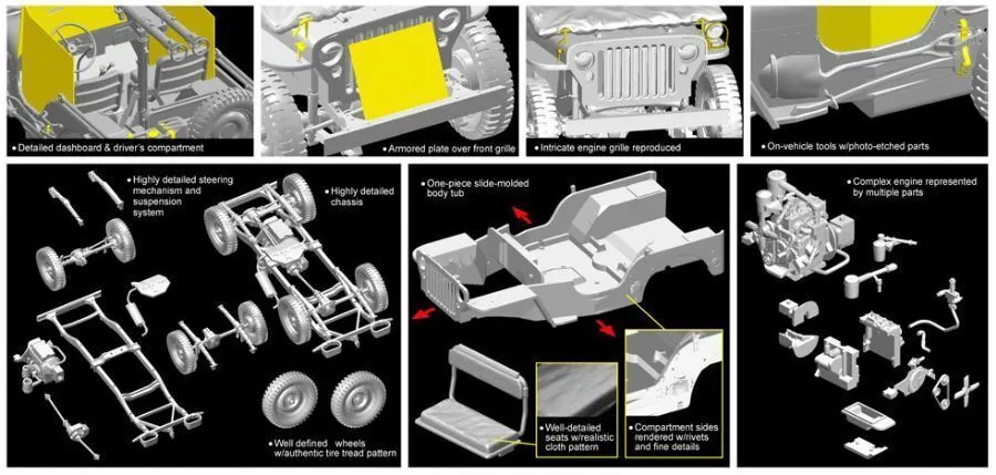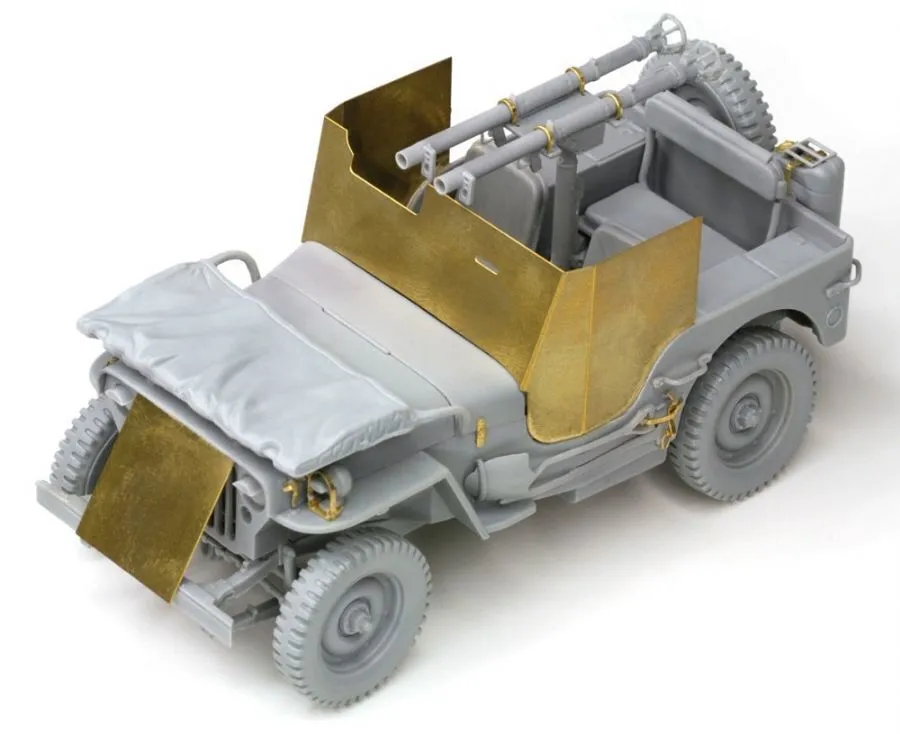 The military vehicle known in official US nomenclature as Truck, 1/4 Ton, 4x4, is probably the world...s most famous design in its class. This iconic WWII vehicle was produced from 1941-45, with more than 634,000 rolling off American production lines. They faithfully served not only the US military, but also allies like the UK, France and Russia. These small 4x4 vehicles were employed in numerous battlefield tasks, with one role being that of reconnaissance and scouting. Some vehicles involved in such missions were fitted with steel plates to better protect the occupants, and early efforts soon led to the fitting of specially designed armor kits.