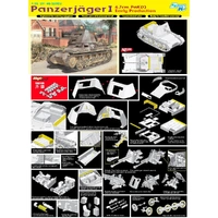 Dragon??s latest 1/35 scale plastic kit shows an Early Production version of the Panzerja"ger I 4.7cm PaK(t). As such, the kit depicts a vehicle built by Alkett in 1940, characterized by a five-sided armored shield. The fighting compartment is created by Dragon using a brand new three-directional slide mold. Not only does this molding allow full detail, but it also incorporates Dragon??s highly praised Razor Edge technology to induce a scale thickness to the armored shield. The engine deck has been correctly rearranged to reflect the configuration of an Early Production vehicle. Photo-etched parts are included for elements like the exhaust muffler cover, while the tank destroyer includes finely detailed parts from previously released Panzer I kits. The Panzerja"ger I also boasts a set of easy-to-assemble Magic Tracks. All in all, Dragon has supplied modelers with a much more effective tank destroyer for their next project!