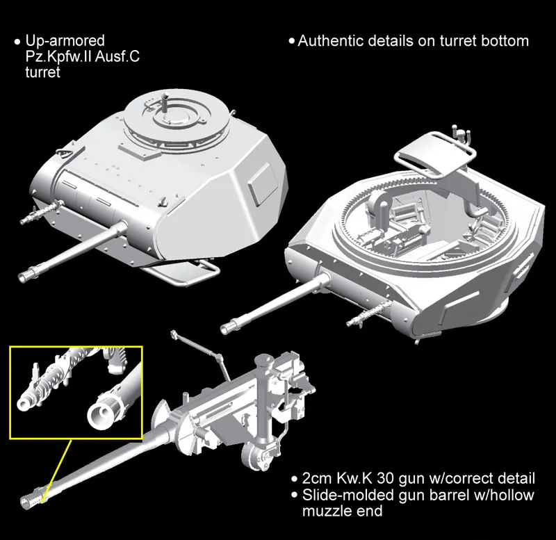 Furthermore, the 2cm cannon is slide molded and possesses a hollow muzzle.