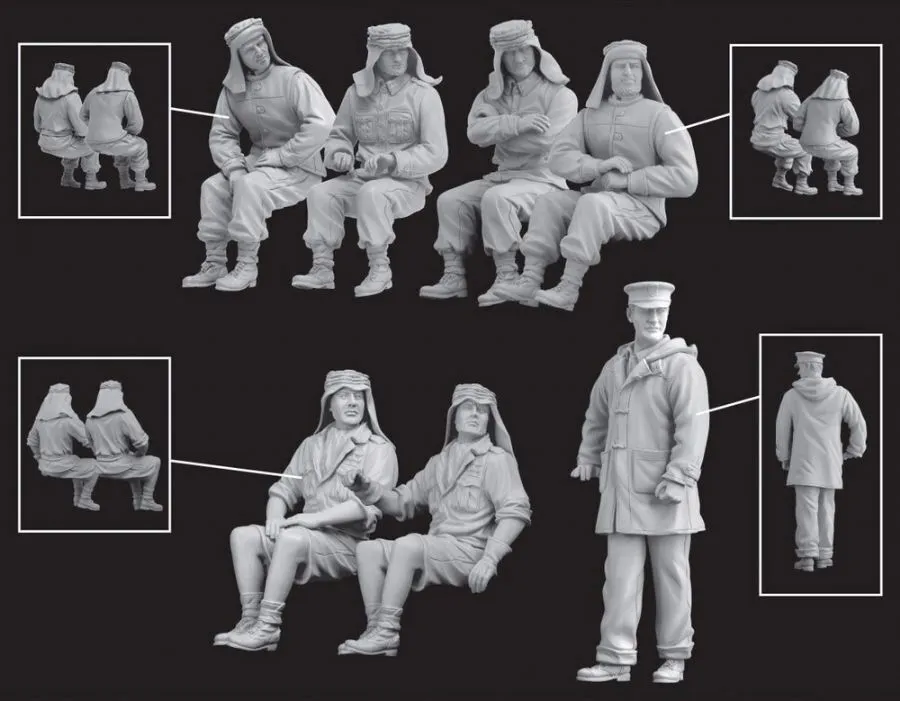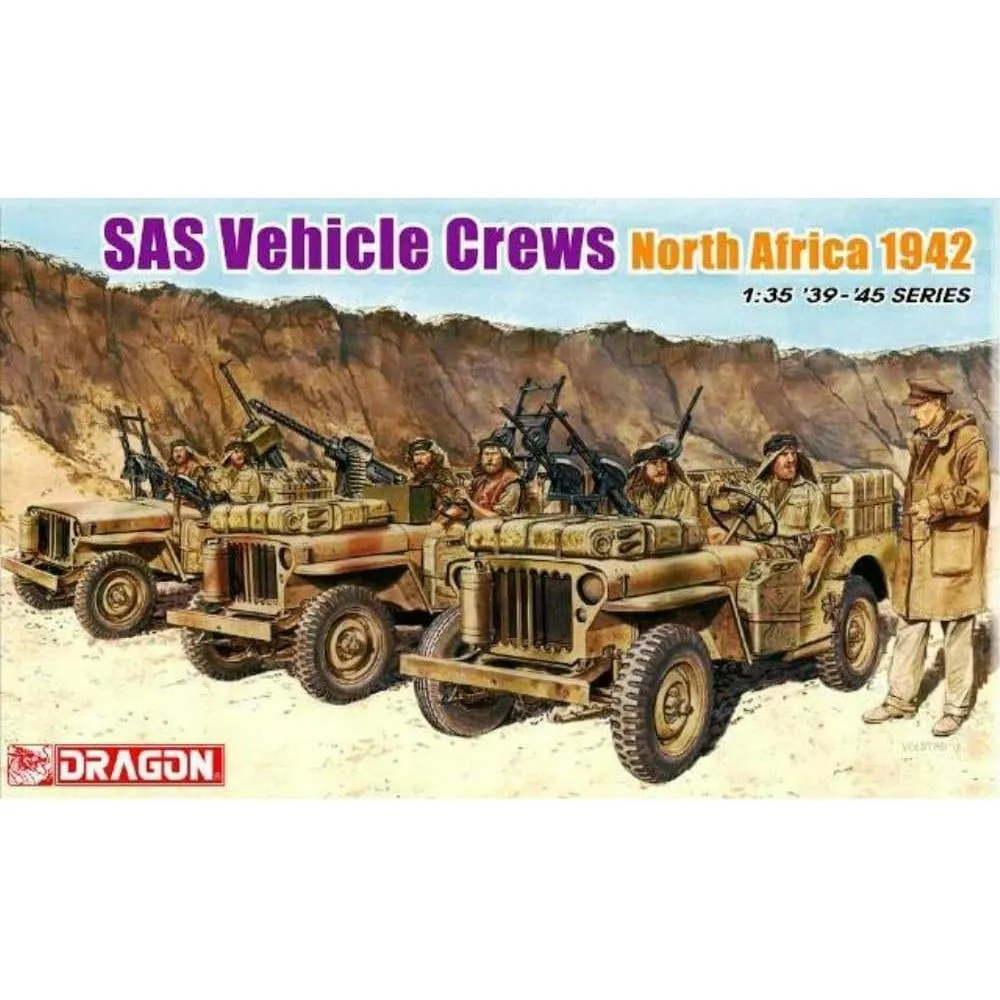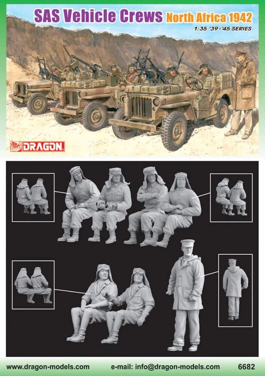 The new 1/35 scale figure set has the commander, Colonel Stirling, as its centerpiece, supported by six other figures sitting in their specially adapted vehicles. The soldiers are all wearing typical SAS garb, a potpourri of styles and apparel. The plastic figures provide a true likeness to the characters in that famous photo. By combining this full set of figures with Dragon...s vehicle sets, modelers can reproduce a piece of history. Or alternatively, the figures are versatile enough to be mixed and matched to produce a completely different scene showing potent SAS teams ranging across the desert sands of North Africa!