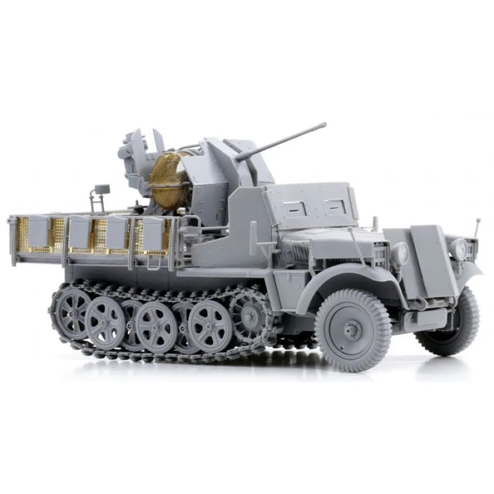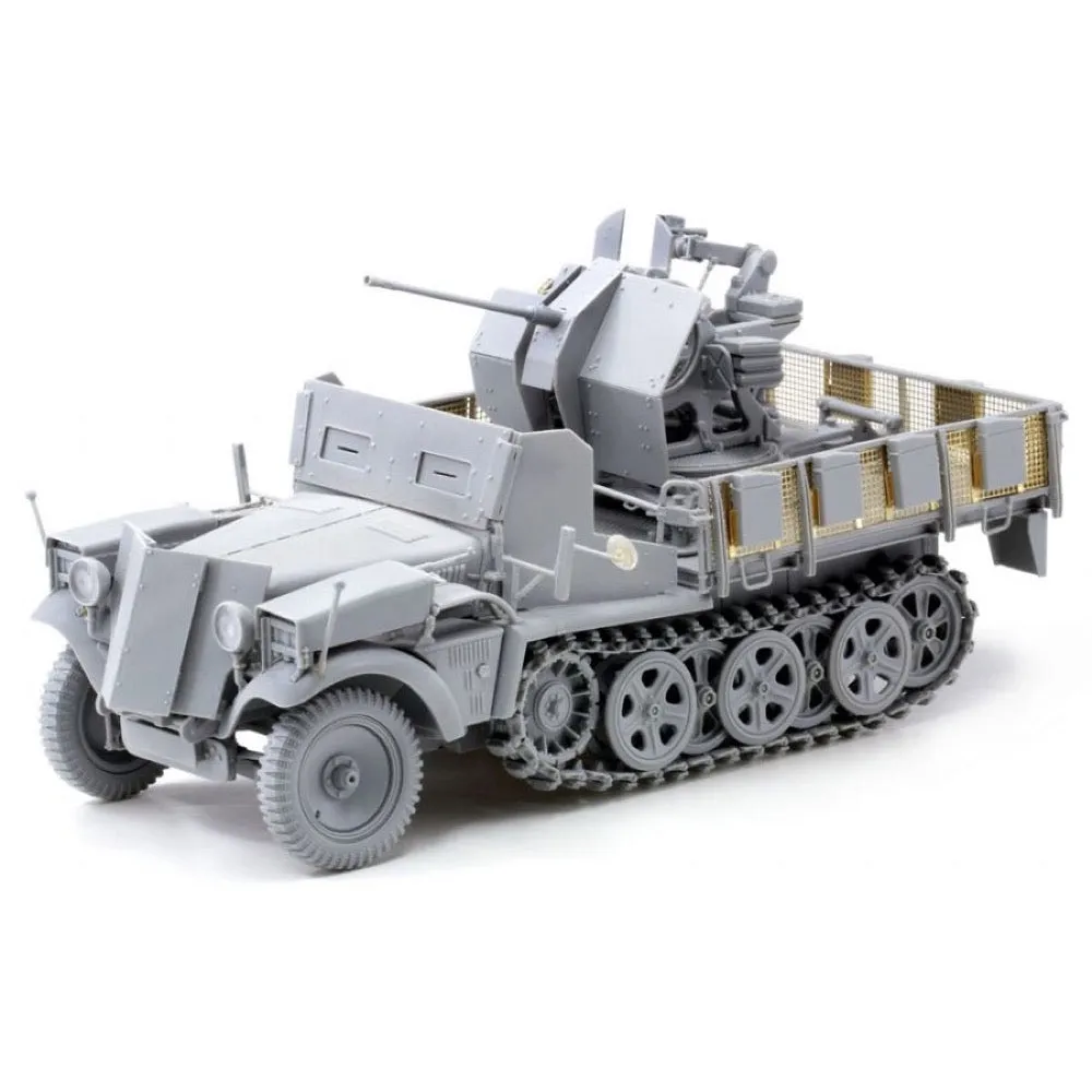 The Sd.Kfz.10 1 ton halftrack was originally designed to tow guns such as the 2cm FlaK 30 or FlaK 38. However, as with most of the other German halftracks, adaptations were produced to suit various needs as they arose, such as field modified versions mounting even a 3.7cm PaK 36, or as in this case, a 2cm FlaK 38. As a result of the little protection offered their crew, some vehicles were given armoured cabs in order to increase their protection.