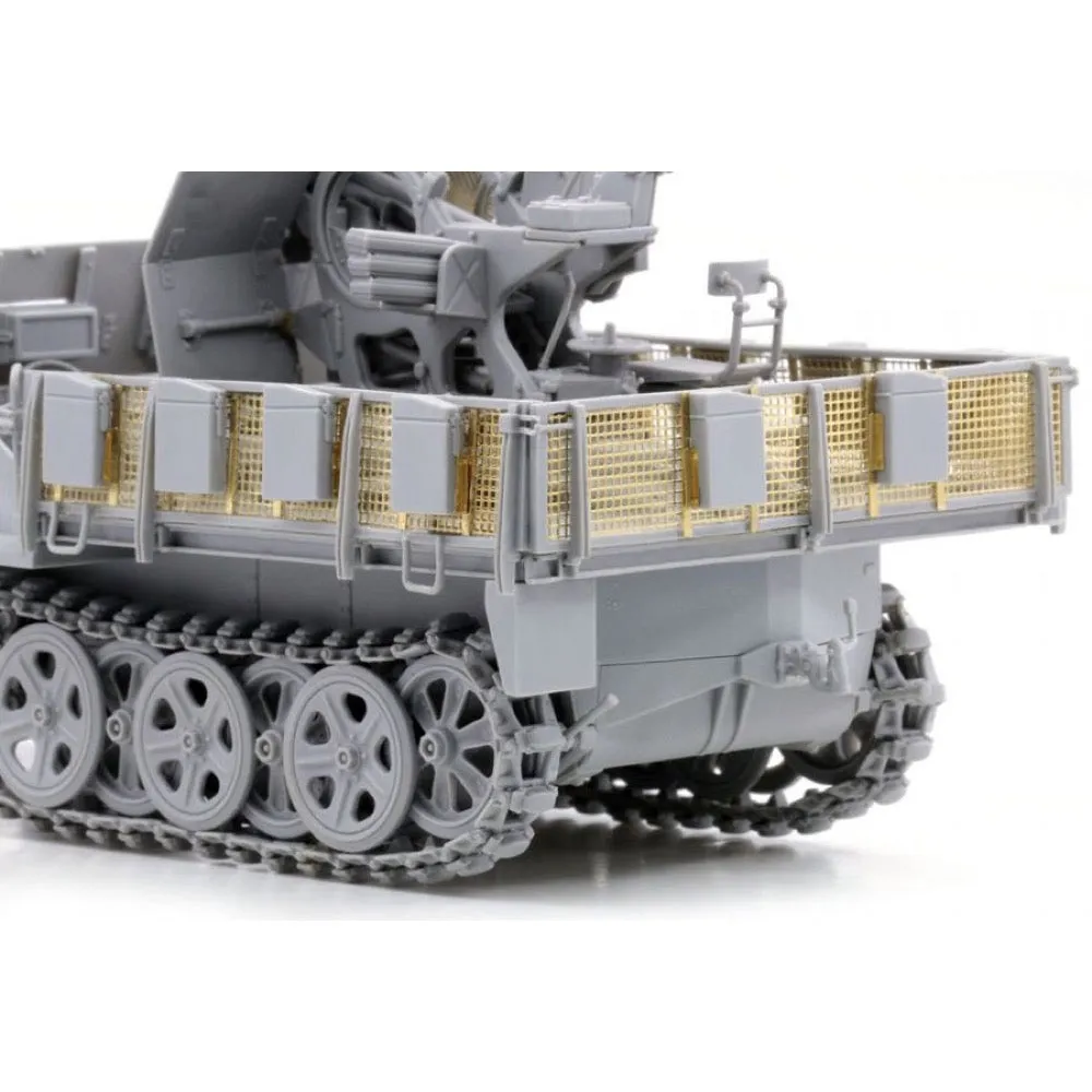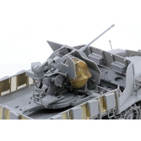 Around 14,000 Sd.Kfz.10 halftracks were built from 1938-45. Several specialist vehicles were based on this halftrack design, among them the Sd.Kfz.10/5. This vehicle had a platform on the rear for carrying an anti-aircraft 2cm FlaK 38 cannon. The purpose-built platform had fold-down sides and rear to give the crew more workspace when in combat. The weapon system was used by both the Wehrmacht and Luftwaffe, and of course the weapon could be equally effective against ground targets. In 1943, the Luftwaffe ordered 293 sets of Behelfspanzerung (armor plates) to protect its Sd.Kfz.10/5 antiaircraft halftracks.