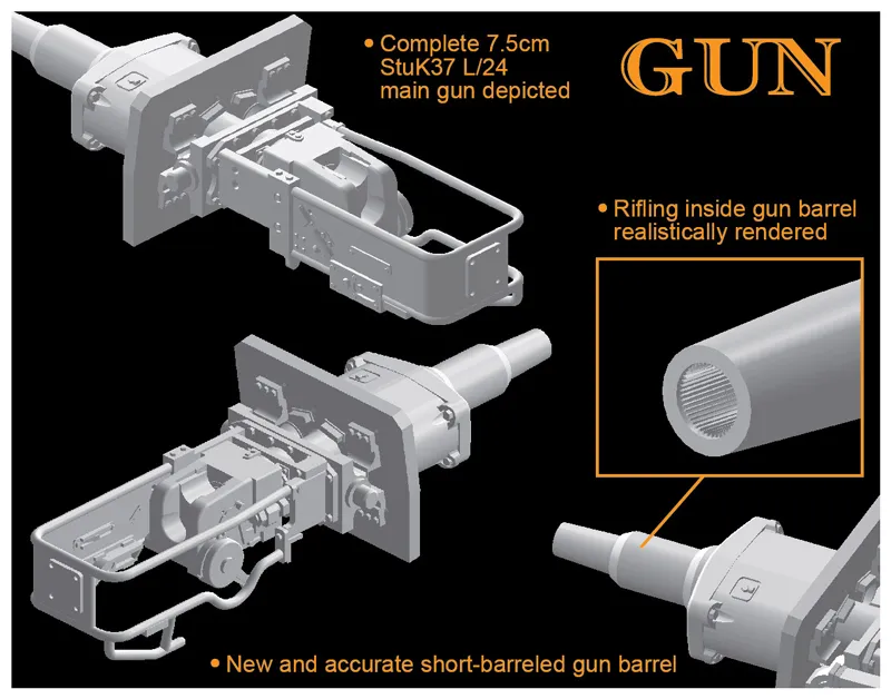 The Sturmgesch..tz III (StuG.III) has the distinction of being Germany...s most widely produced AFV of WWII, with 10,619 eventually manufactured. Based on the chassis of the Panzer III, it was cheaper and faster to build since it did not have a rotating turret. The Ausf.E, still equipped with the same short-barreled 75mm StuK37 L/24 gun as preceding marks, was produced from September 1941 through to March 1942. Some 272 rolled off Germany...s factory floors in that period. This variant...s major improvement over its predecessor was a new armored pannier on the right side of the superstructure to accommodate radio equipment. Increased space inside allowed an extra six 75mm rounds to be carried. An MG34 was stowed internally too, and smaller hinges for the inspection hatches were another distinguishing feature of the Ausf.E...