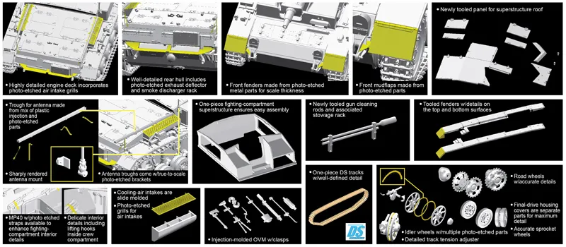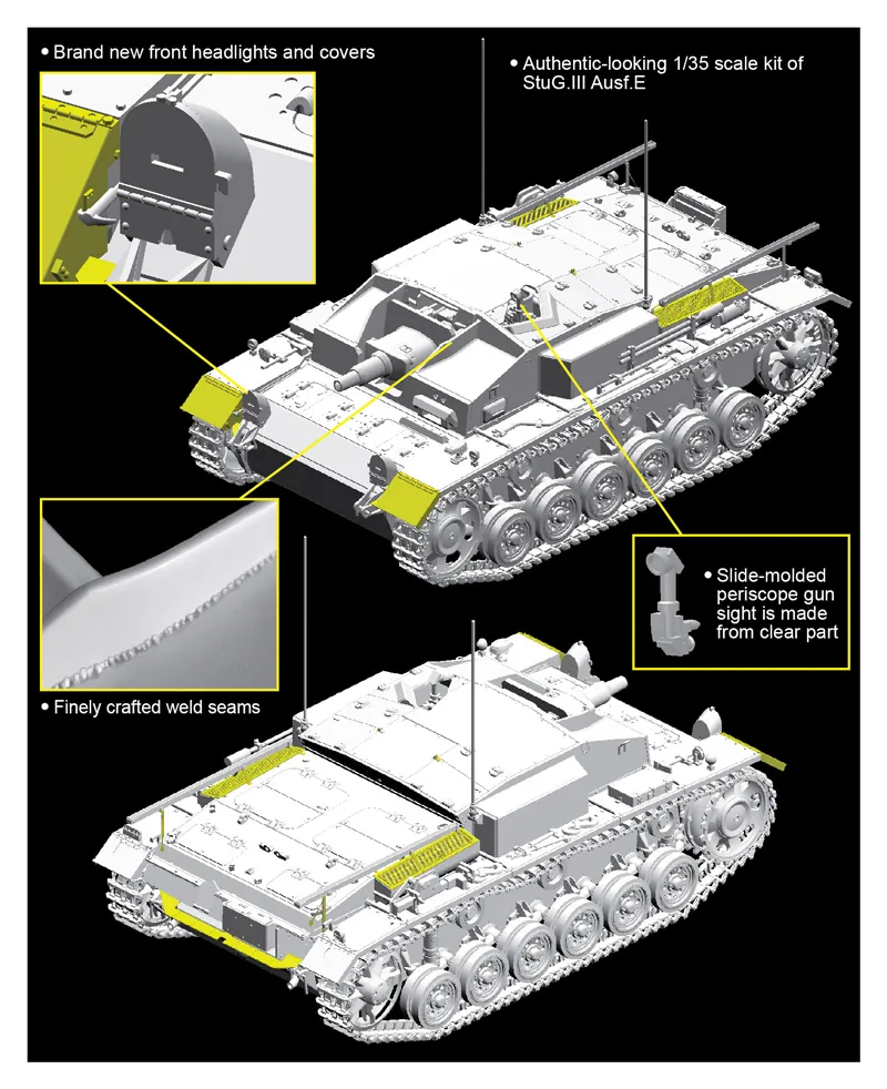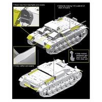 Dragon has already launched a number of splendid new-generation 1/35 scale kits of the StuG.III family, but to date these have been later production types like the Ausf.G. Dragon is now redressing this gap by offering a brand new kit of the Ausf.E, which is designed by Japanese designers and Dragon team. Also it is the only 1/35 StuG.III Ausf.E in nowadays standard available on market! This 1/35 scale rendition of the tank destroyer boasts many great new plastic parts. These include the superstructure roof, headlights and covers, StuK37 short-barreled gun, fighting-compartment floor, frontal armor and cleaning rods in their associated rack. This is Dragon...s finest model ever of the important StuG.III Ausf.E, and modelers will find it a treat to assemble and finish thanks to its superior level of detail and ease of assembly.