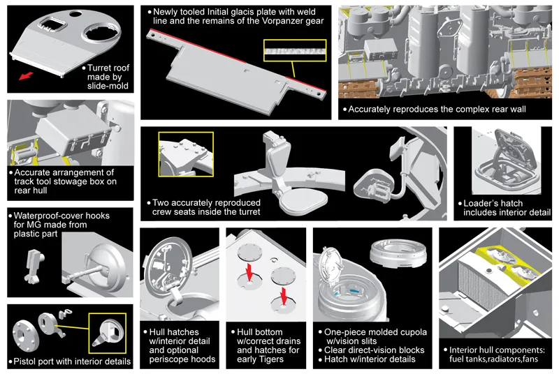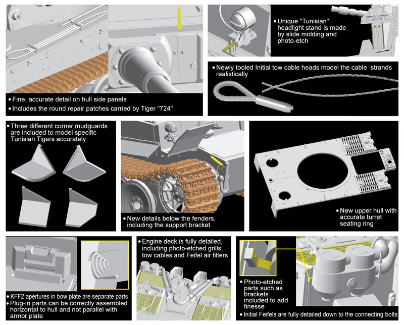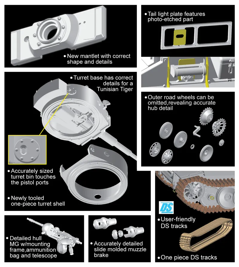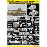 The Tigers of the 501 Heavy Battalion led several battles against American, British and French forces, including Sidi Bouzid. Sent to Tunisia in November 1942 to bolster Rommel...s army, they inspired ...Tiger phobia.. in the allied tank crews. Whether in the open desert of the south, or the hills and farms of the north, they were a decisive weapon. These Tigers with their outsize turret numbers, their green ...tropical.. camouflage and their prototype equipment, have a unique appearance. Dragon has incorporated new research into this model, accurately reproducing the most famous veteran Tigers of the 1st Company.