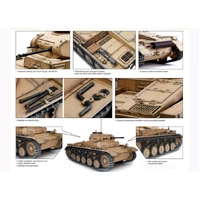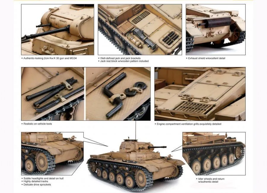 The first ever tank in Dragon’s 1/6 scale plastic kit lineup was the Panzer II Ausf.B (Item No.75025), which created worldwide excitement in the modeling and 1/6 action figure community! Now Dragon has doubled the number of Panzer IIs available with a second variant release! This time it’s a Panzer II Ausf.C, a type produced by Germany from June 1938 through till April 1940. It was operated by a crew of three, and the Ausf.C was the most common variant of the Panzer II family. In the turret were a 20mm KwK.30 cannon and a 7.92mm MG34 machine gun. Panzer II Ausf.C tanks were in the forefront of the German invasion of France in 1940, while a number were also dispatched to North Africa to fight with the legendary Deutsches Afrika Korps (DAK).