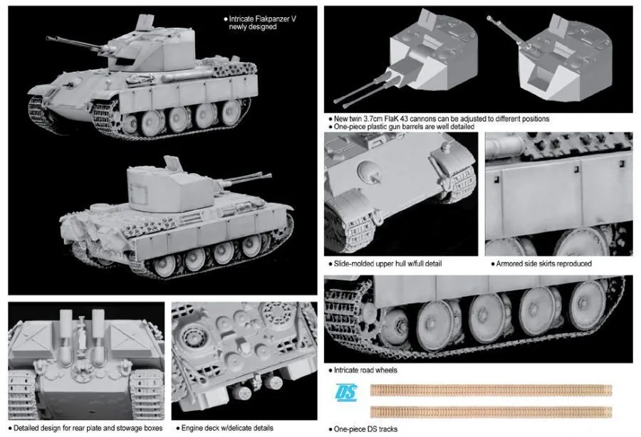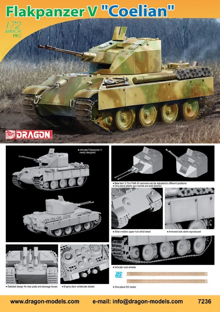 Germanys Luftwaffe was numerically outnumbered as WWII progressed, with the Fatherland and tactical units constantly being bombed and strafed by enemy aircraft. This called for more effective antiaircraft systems than Germany hitherto possessed, which initially were often poorly protected halftracks. New self-propelled AA types were put into service, including the Flakpanzer IV. A new type was also planned ... the Flakpanzer V Coelian from Rheinmetall - though it was never put into production due to the wars end and the lack of enough chassis for conversion. The Coelian featured a special armored turret that would protect the crew inside the vehicle. It used a standard Panther tank chassis upon which were mounted twin 3.7cm FlaK 43 cannons.