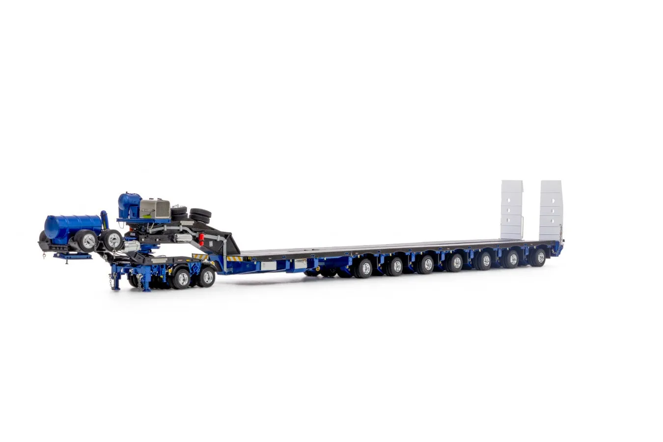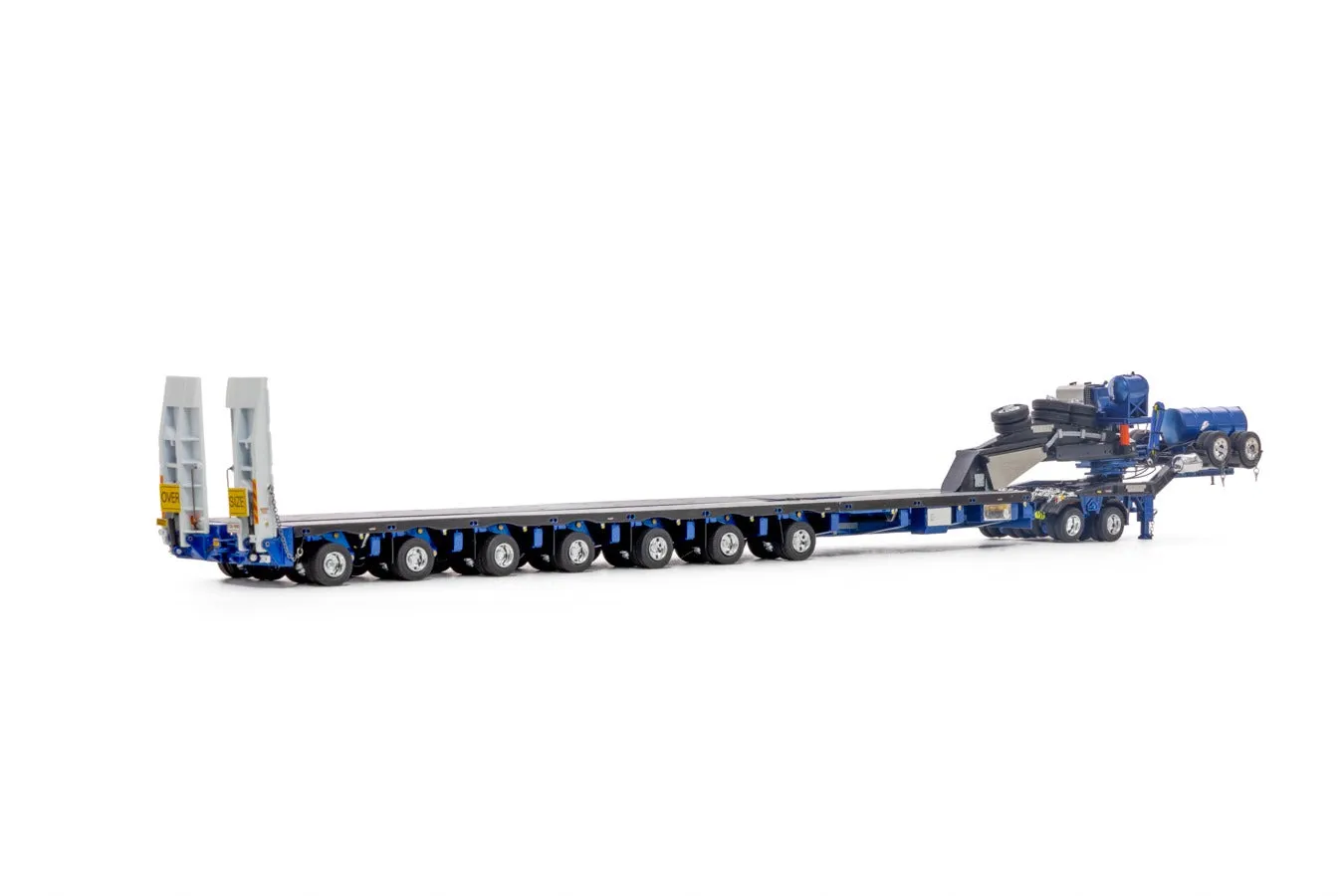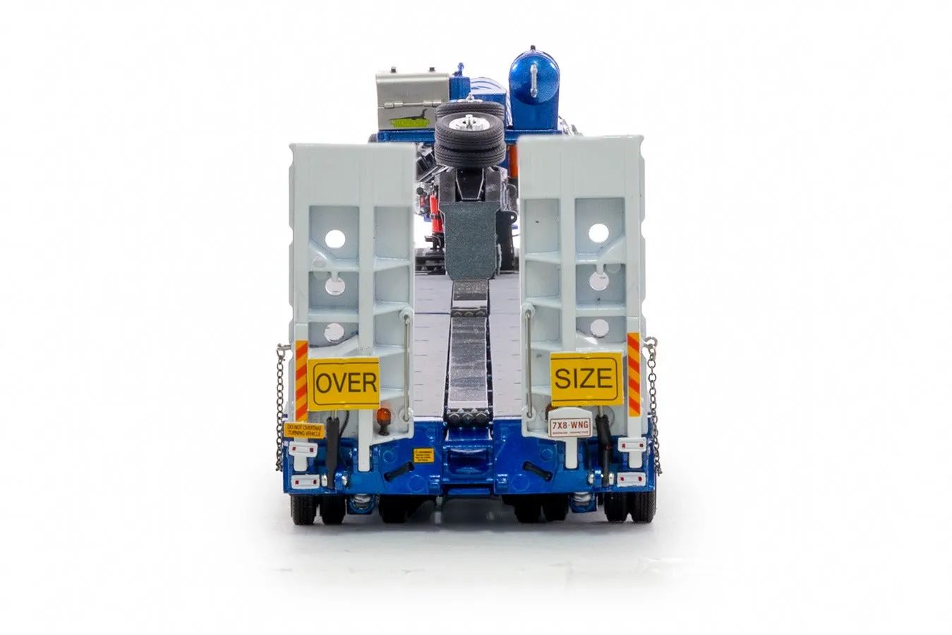Scale: 1:50 - Make/Model : Drake 7x8 Steerable Trailer - Colour: Blue / Grey - Details: - Diecast construction - 56 rubber tyres and spares (8 tyres per row) - Detailed hydraulic system including rams - Replicated hydraulic power pack, tank and lines - Rubber mud flaps - Detailed operating controls - Oversize signs - Australian Number Plates - Rear push point - Air and Water Tanks - Modular Construction with removable goose neck and rear bumper - Widening decks with notched locking - Rotating and sliding head assembly - Raise lower gooseneck - Opening engine covers - Opening control covers - Contra rotating steering - Linkable steerable between modules - Working Suspension - Functioning loading ramps with chains - Manufacturer: Drake Collectibles