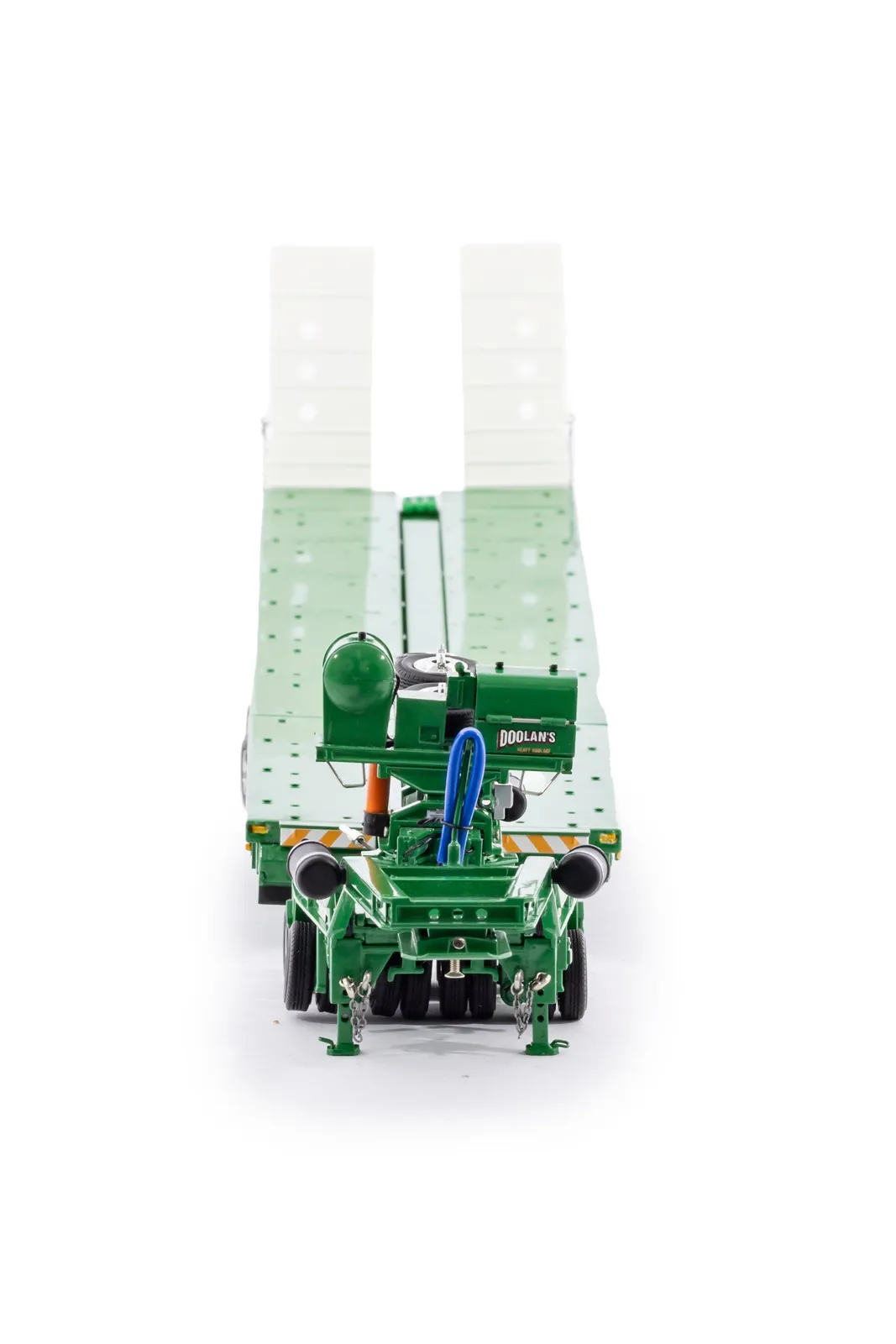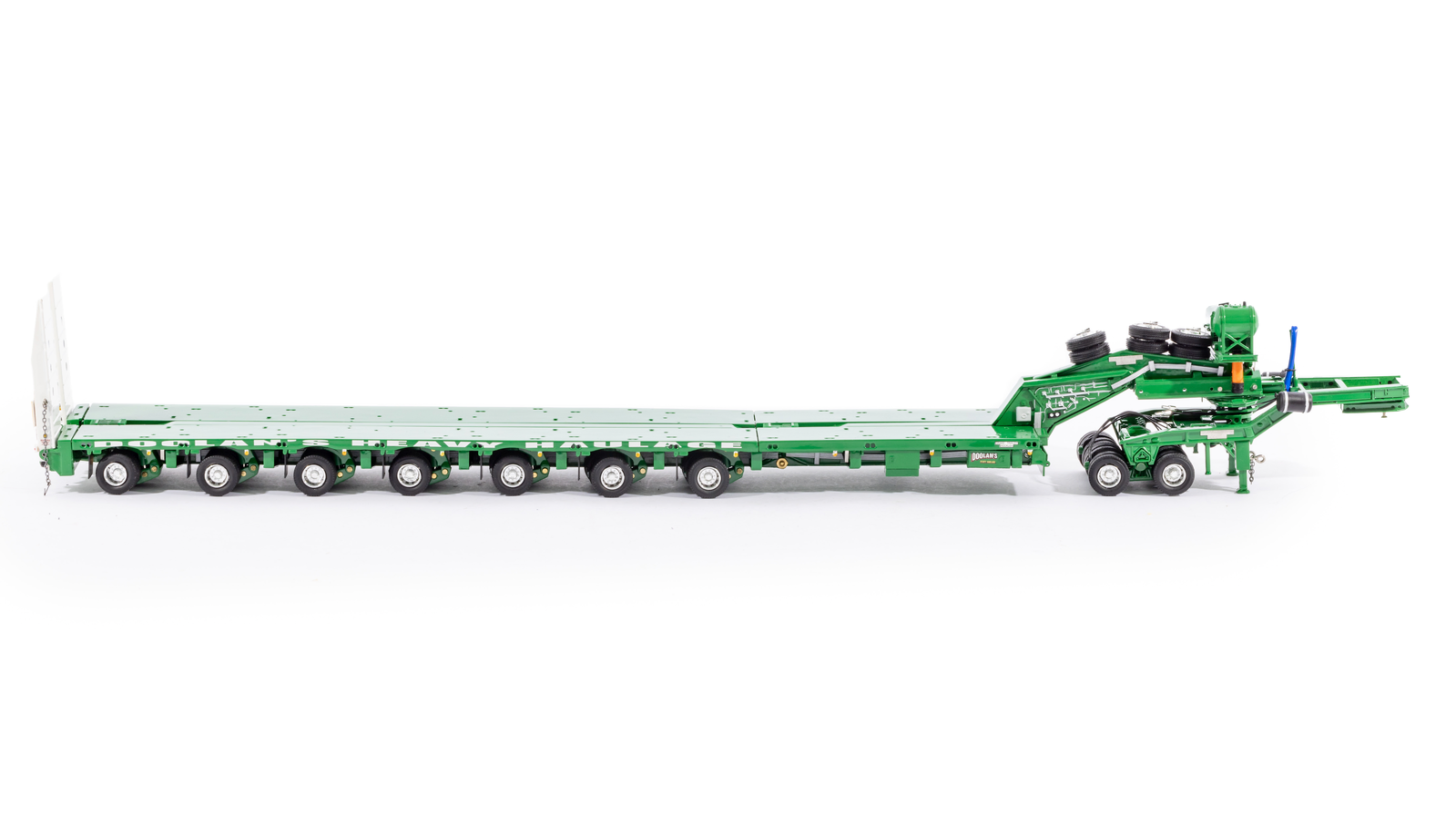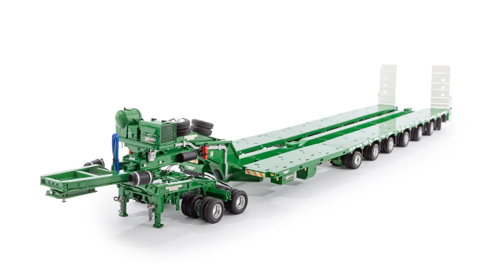 Scale: 1:50 - Make/Model : Drake 7x8 Steerable Trailer - Colour: Doolan's Heavy Haulage - Details: - Diecast construction - 56 rubber tyres and spares (8 tyres per row) - Detailed hydraulic system including rams - Replicated hydraulic power pack, tank and lines - Rubber mud flaps - Detailed operating controls - Oversize signs - Australian Number Plates - Rear push point - Air and Water Tanks - Modular Construction with removable goose neck and rear bumper - Widening decks with notched locking - Rotating and sliding head assembly - Raise lower gooseneck - Opening engine covers - Opening control covers - Contra rotating steering - Linkable steerable between modules - Working Suspension - Functioning loading ramps with chains - Manufacturer: Drake Collectibles