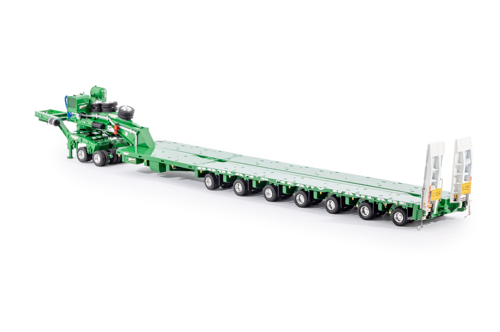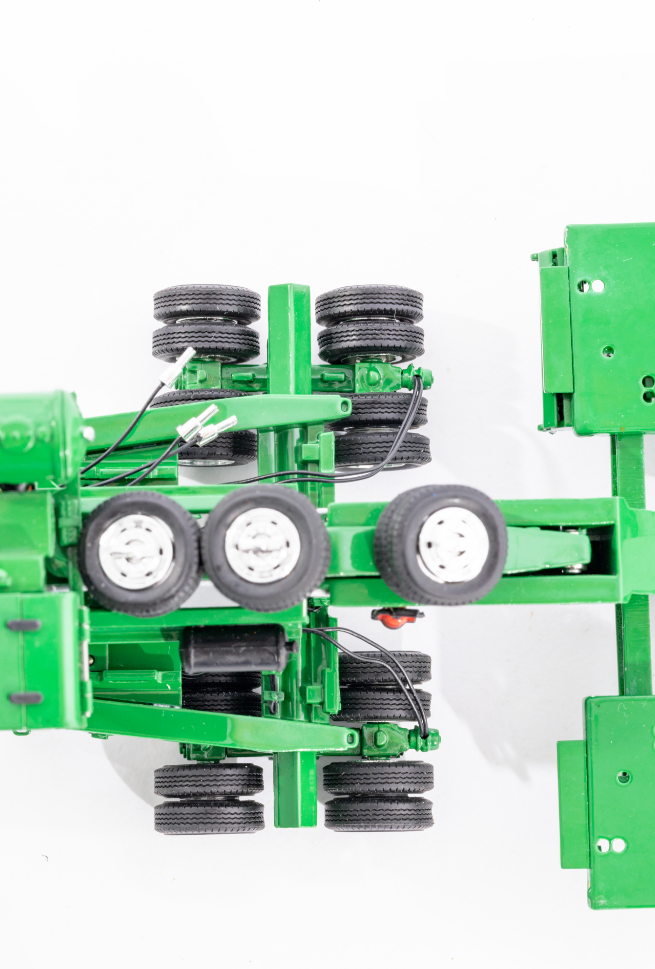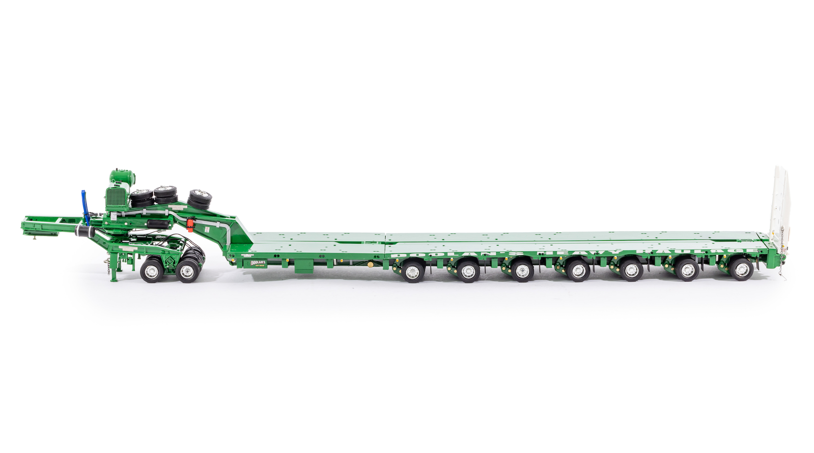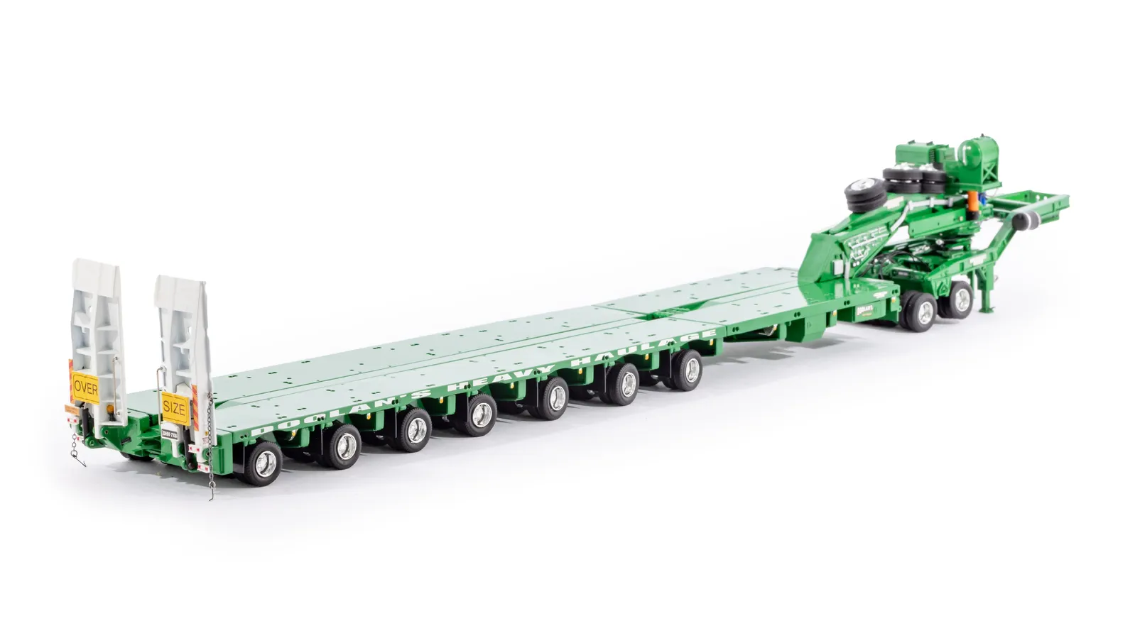 DetailsDiecast construction 56 rubber tyres and spares (8 tyres per row) Detailed hydraulic system including rams Replicated hydraulic power pack, tank and lines Rubber mud flaps Detailed operating controls Oversize signs Australian Number Plates Rear push point Air and Water Tanks Modular Construction with removable goose neck and rear bumper Widening decks with notched locking Rotating and sliding head assembly Raise lower gooseneck Opening engine covers Opening control covers Contra rotating steering Linkable steerable between modules Working Suspension Functioning loading ramps with chains