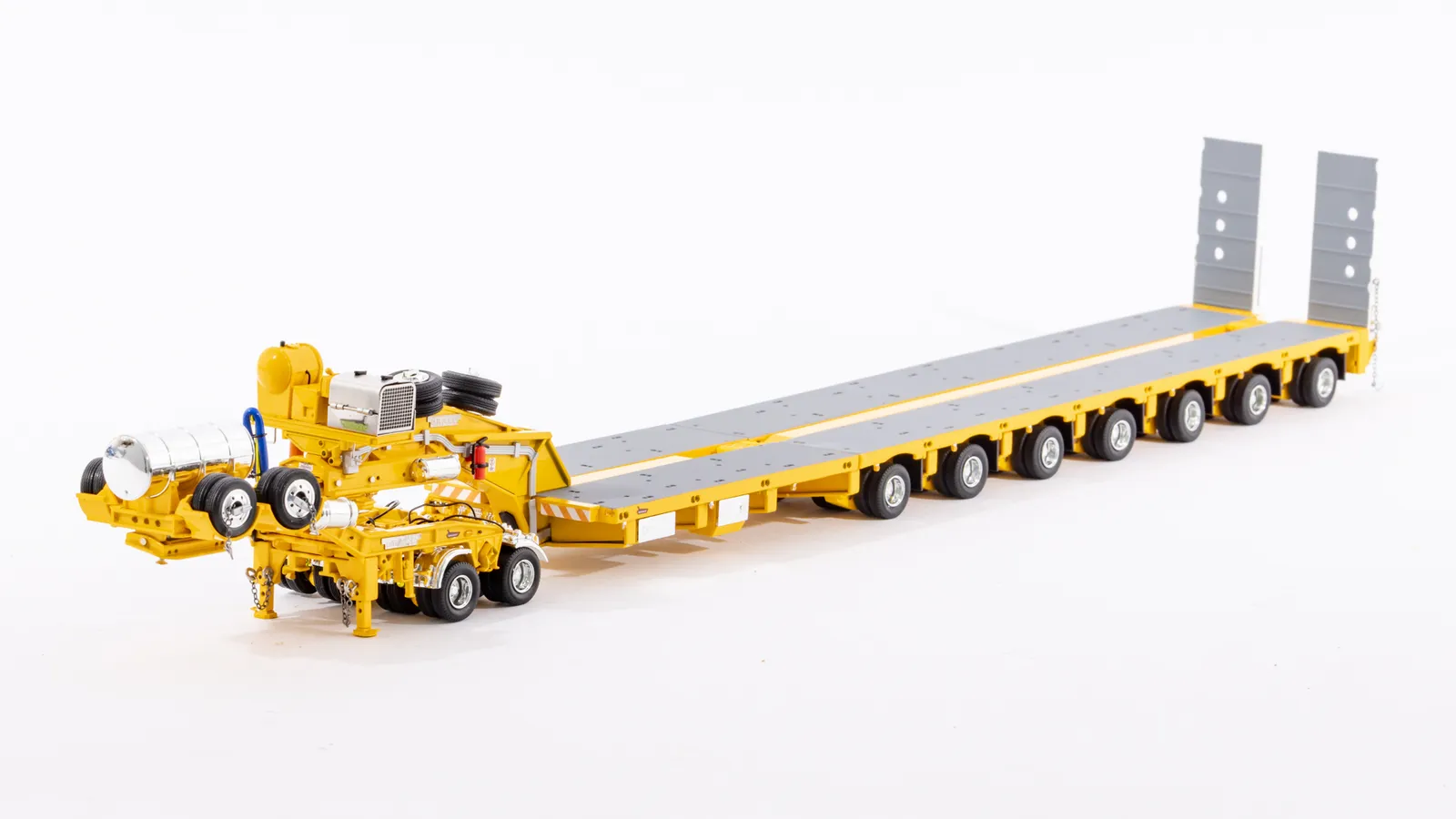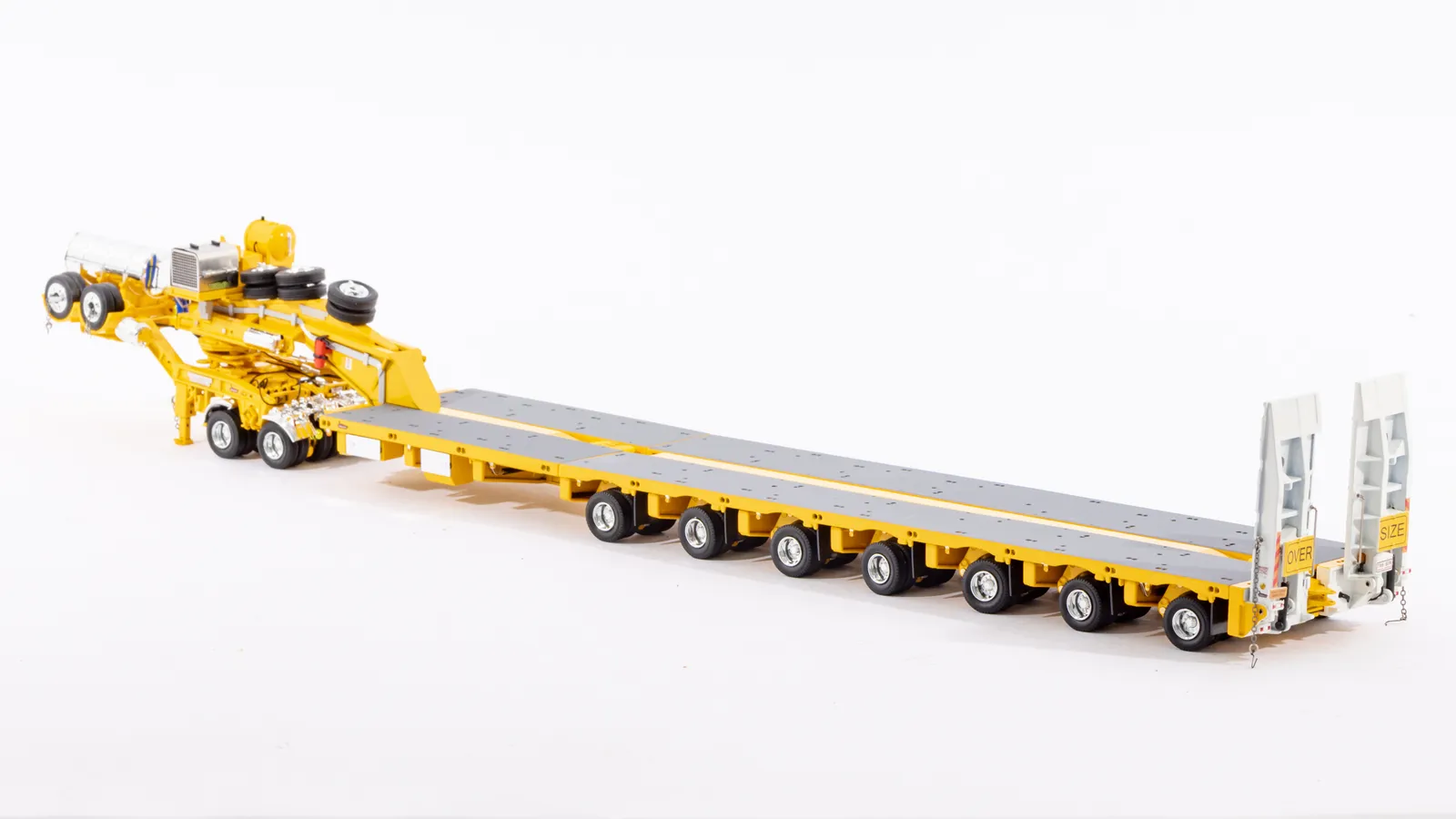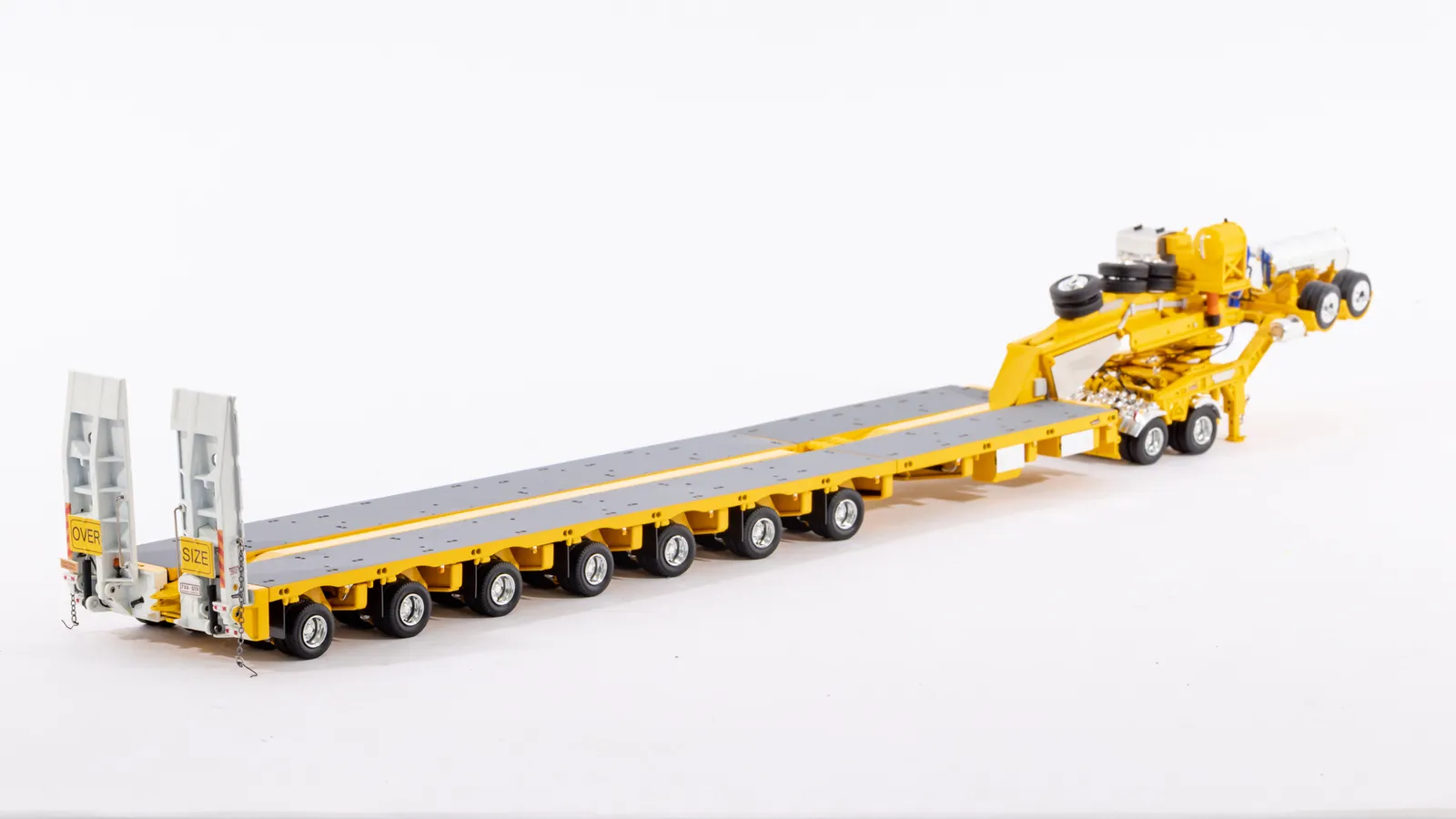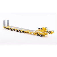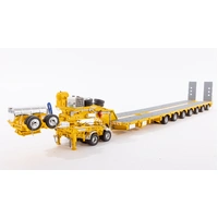 DetailsDiecast construction 56 rubber tyres and spares (8 tyres per row) Detailed hydraulic system including rams Replicated hydraulic power pack, tank and lines Rubber mud flaps Detailed operating controls Oversize signs Australian Number Plates Rear push point Air and Water Tanks Modular Construction with removable goose neck and rear bumper Widening decks with notched locking Rotating and sliding head assembly Raise lower gooseneck Opening engine covers Opening control covers Contra rotating steering Linkable steerable between modules Working Suspension Functioning loading ramps with chains