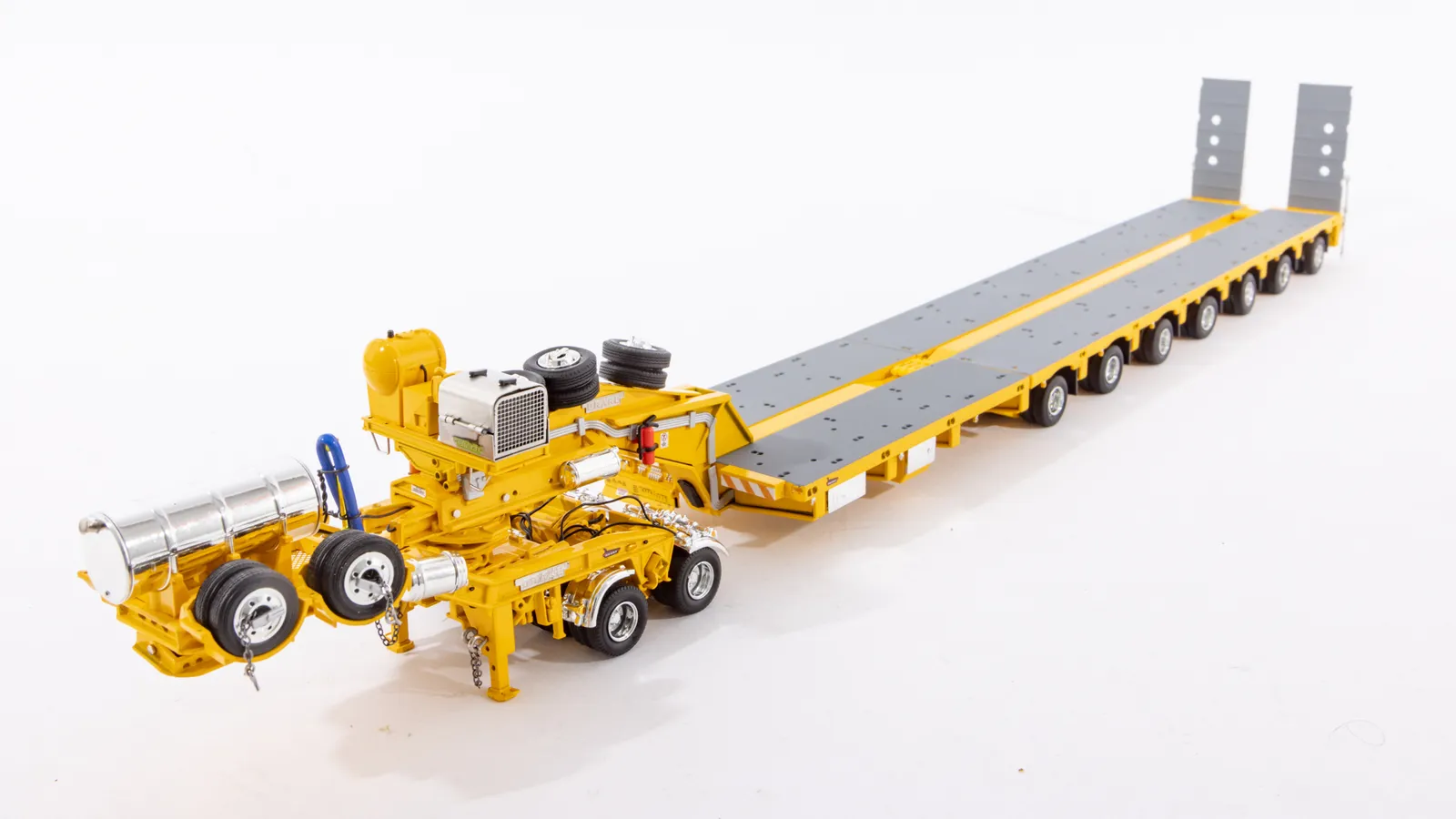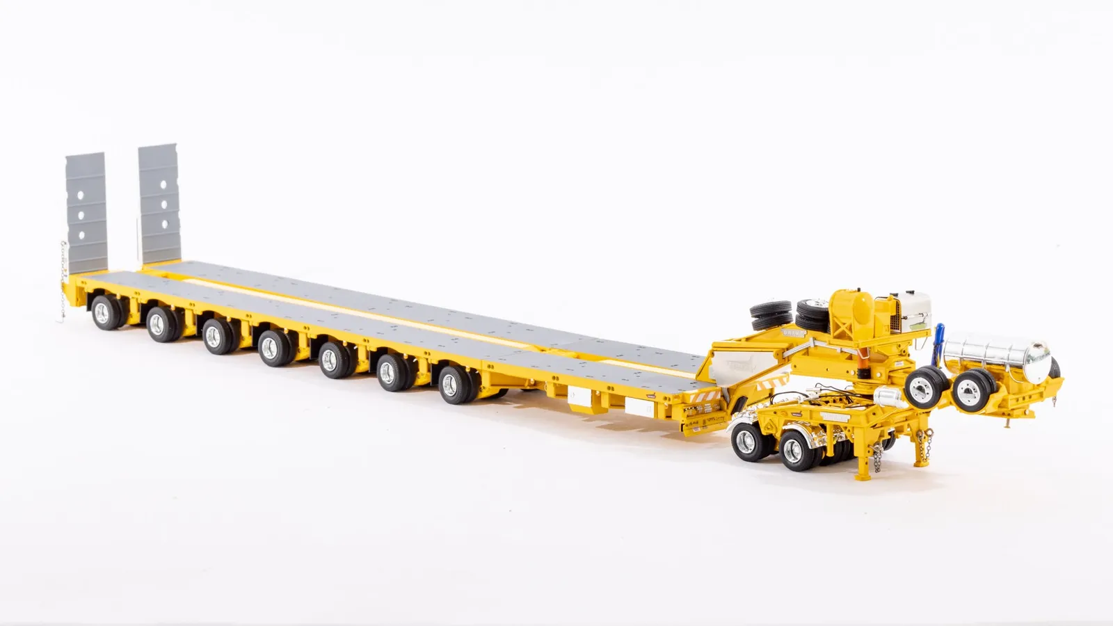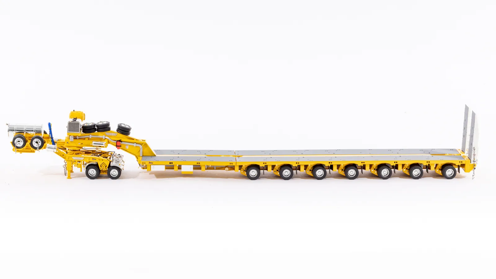 DetailsDiecast construction 56 rubber tyres and spares (8 tyres per row) Detailed hydraulic system including rams Replicated hydraulic power pack, tank and lines Rubber mud flaps Detailed operating controls Oversize signs Australian Number Plates Rear push point Air and Water Tanks Modular Construction with removable goose neck and rear bumper Widening decks with notched locking Rotating and sliding head assembly Raise lower gooseneck Opening engine covers Opening control covers Contra rotating steering Linkable steerable between modules Working Suspension Functioning loading ramps with chains