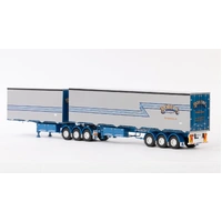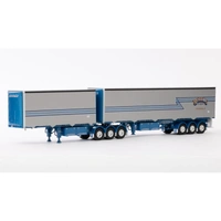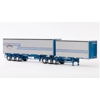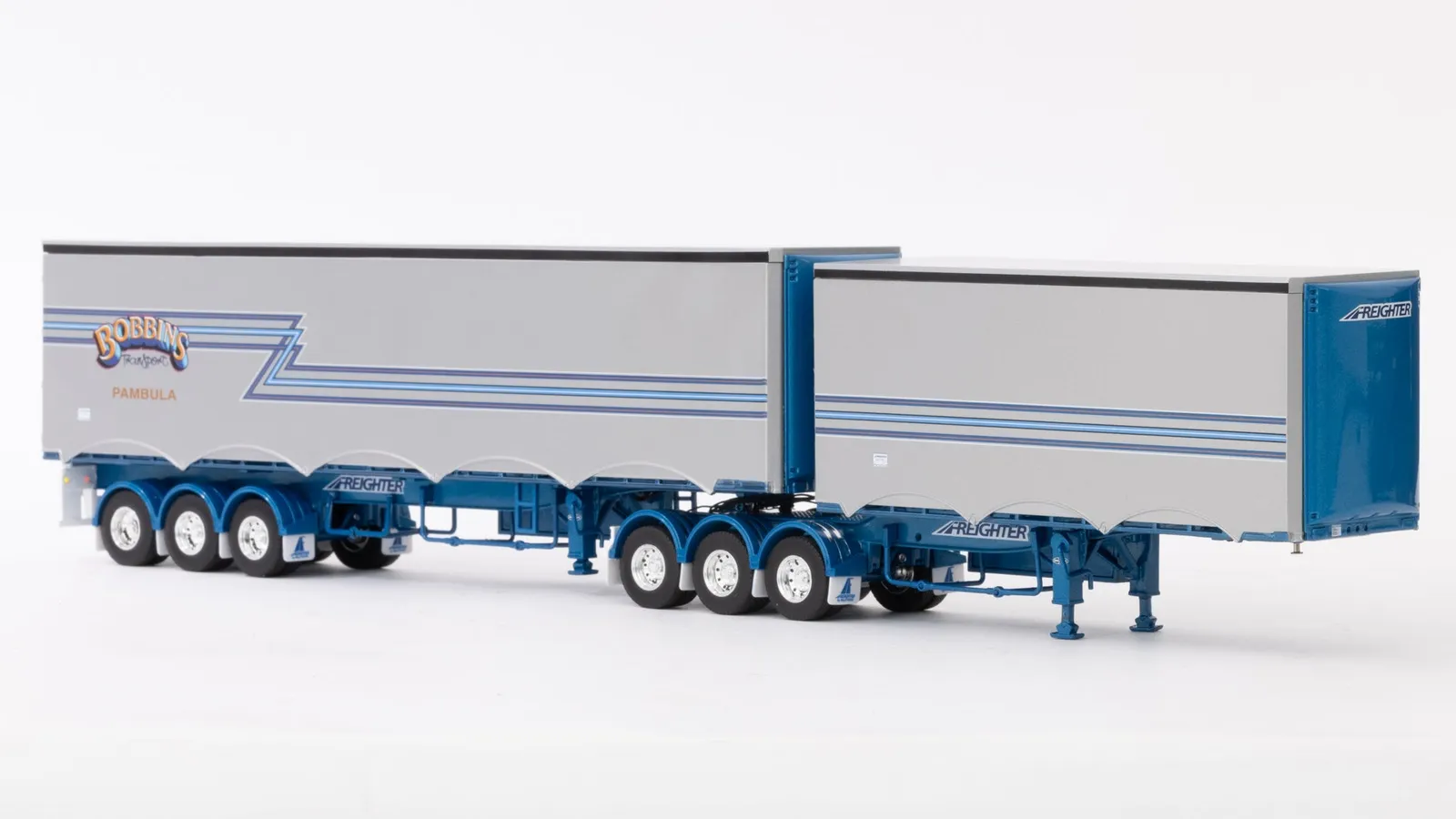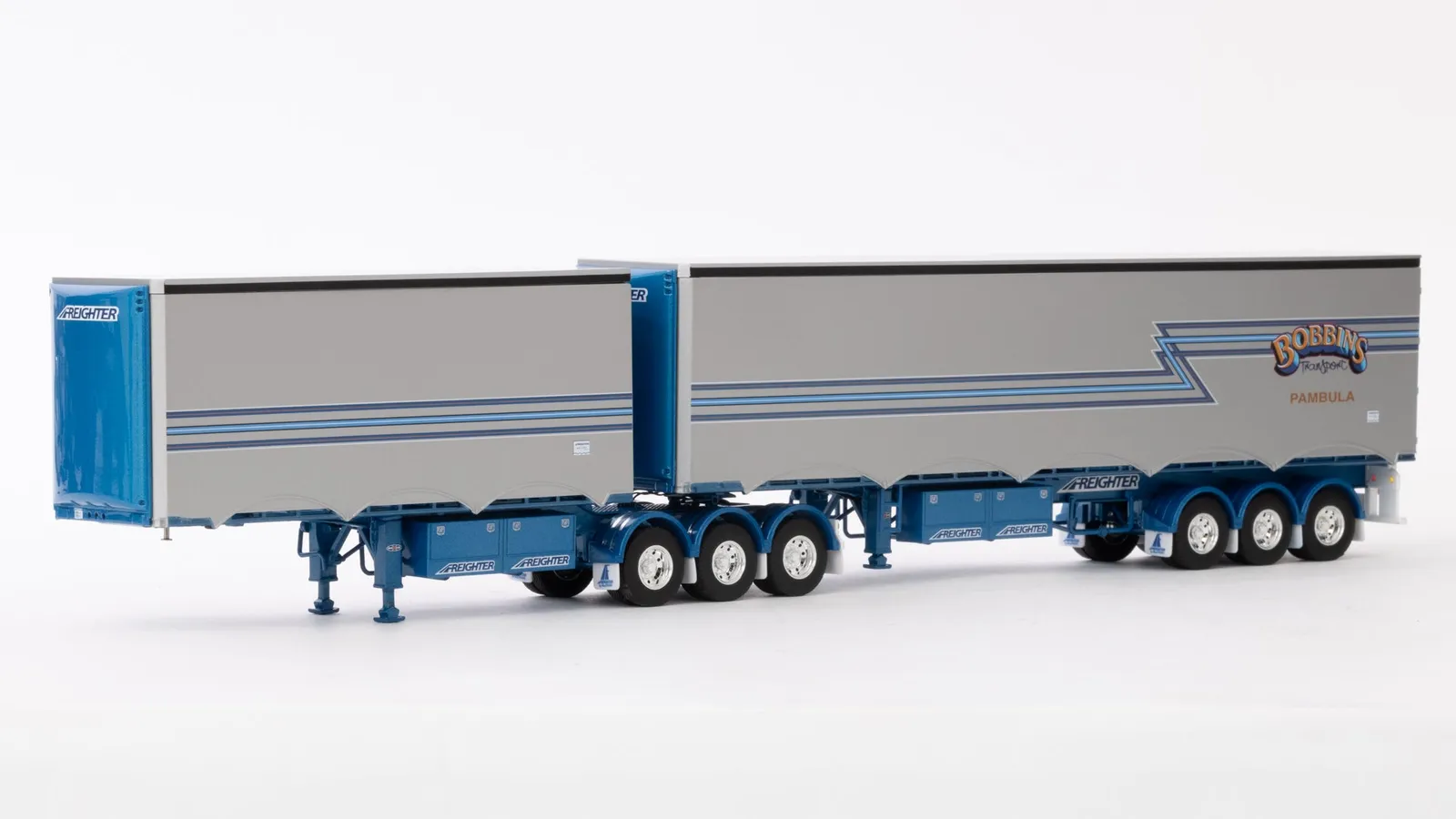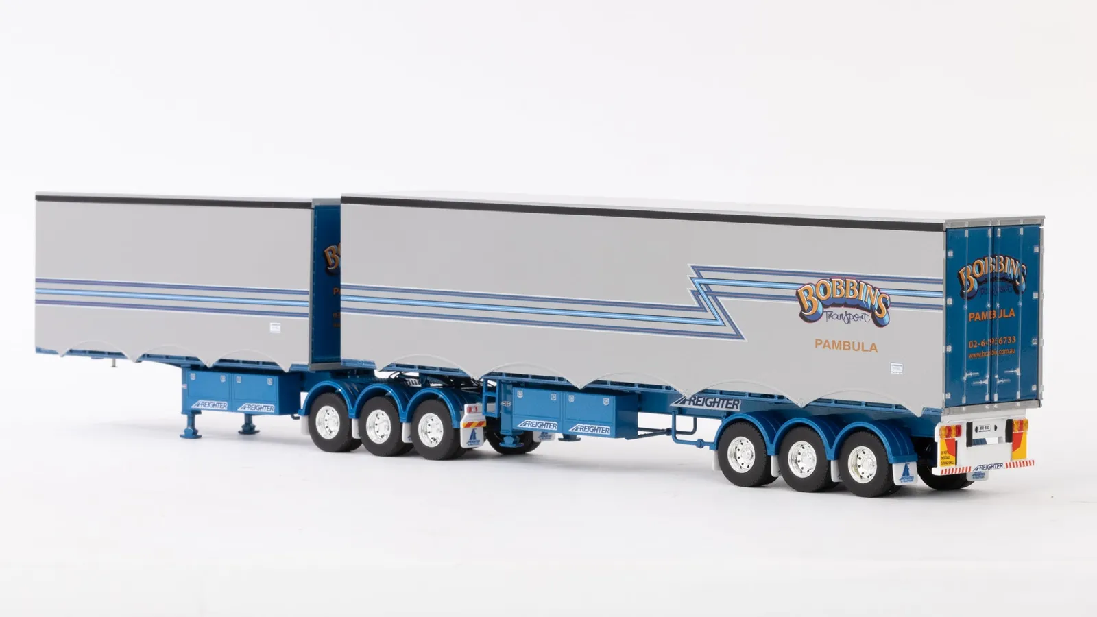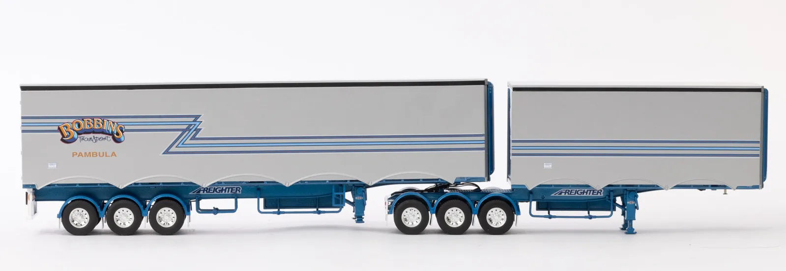 Scale: 1:50 - Make/Model : Eziliner B-Double Trailer Set - Colour: Bobbins Transport - Details: Detailed model of the Freighter Eziliner B-Double Trailer - Features: - Opening Doors on the B-trailer - Detailed Interior on the B-trailer - Spare Tyre Carrier with Wheels - Air Hoses, Wiring and Tool Boxes - Rubber Tyres and Mud Flaps - Australian Number Plates - Working Suspension - Adjustable Trailer Legs - Manufacturer: Drake Collectibles