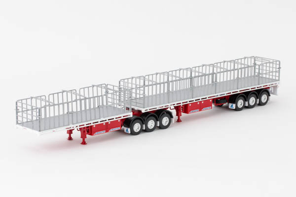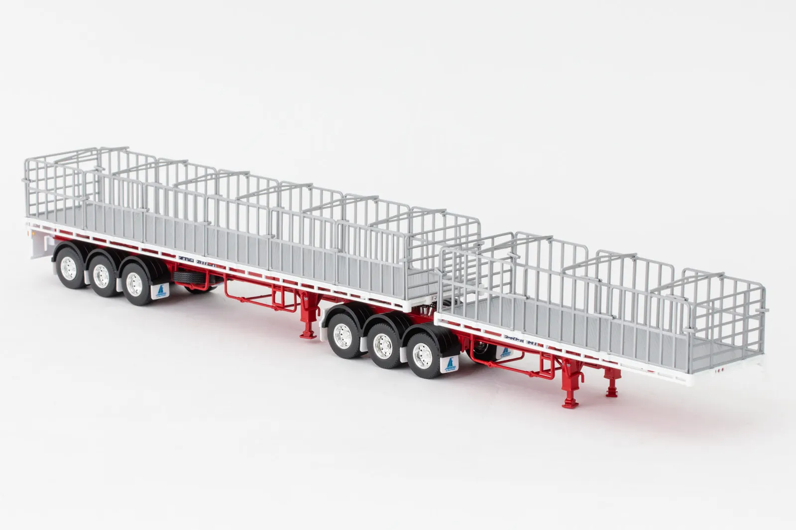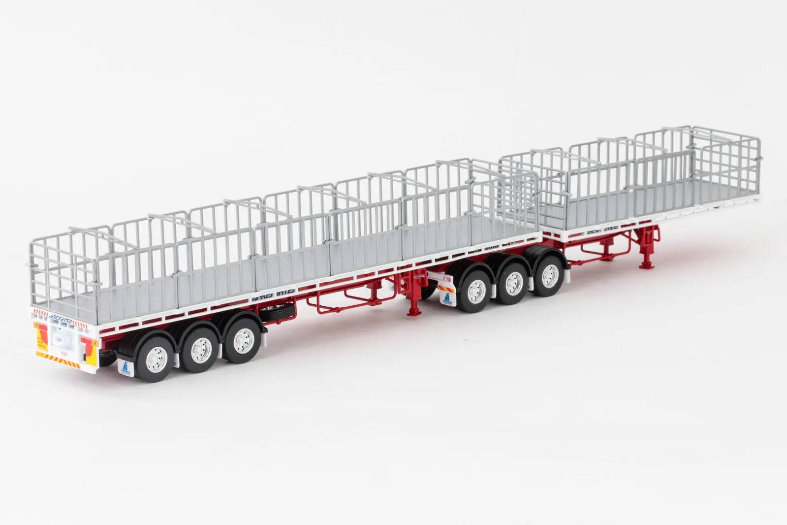 Scale: 1:50 - Make/Model : Freighter B Double Flat Top - Colour: White/Red - Features: - Removable Steel Gates and Bows - Replicated Air Hoses - Gate Storage - Tool Boxes - Oscillating & Locking 5th Wheel - Wind Down Legs - Working Suspension - Model Dimensions - A Trailer: 220mm x 50mm x 35 mm (65mm with gates) - B Trailer: 175 mm x 50 mm x 35mm (65mm with gates) - Manufacturer: Drake Collectibles