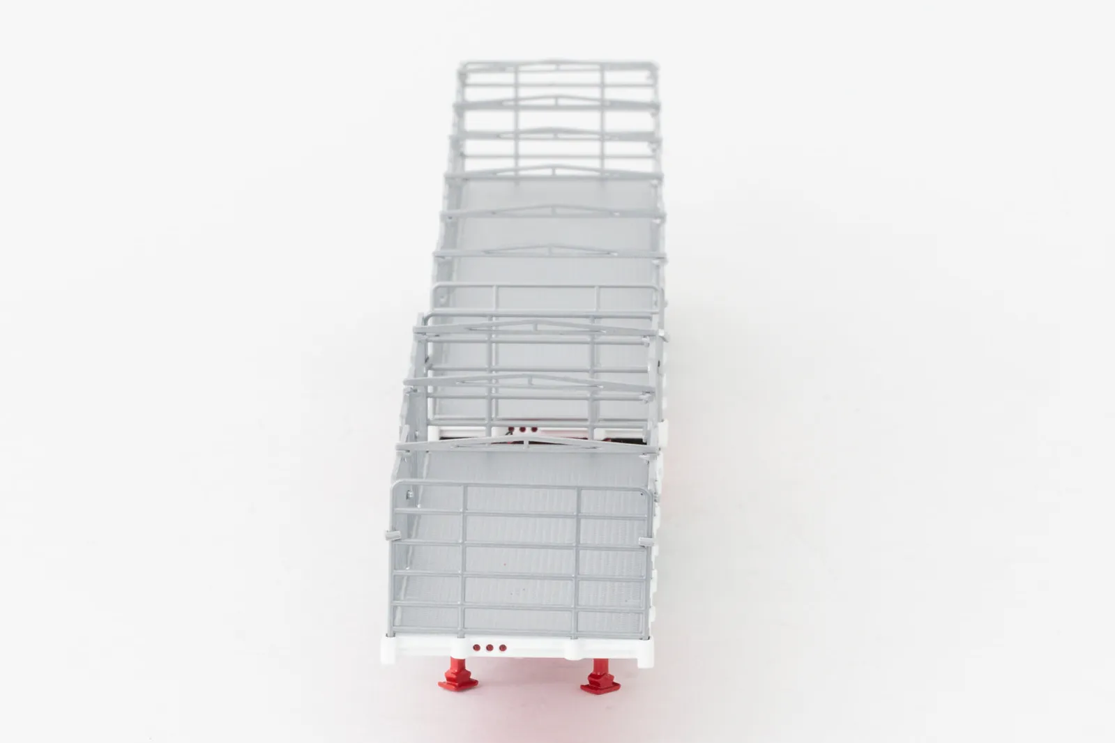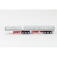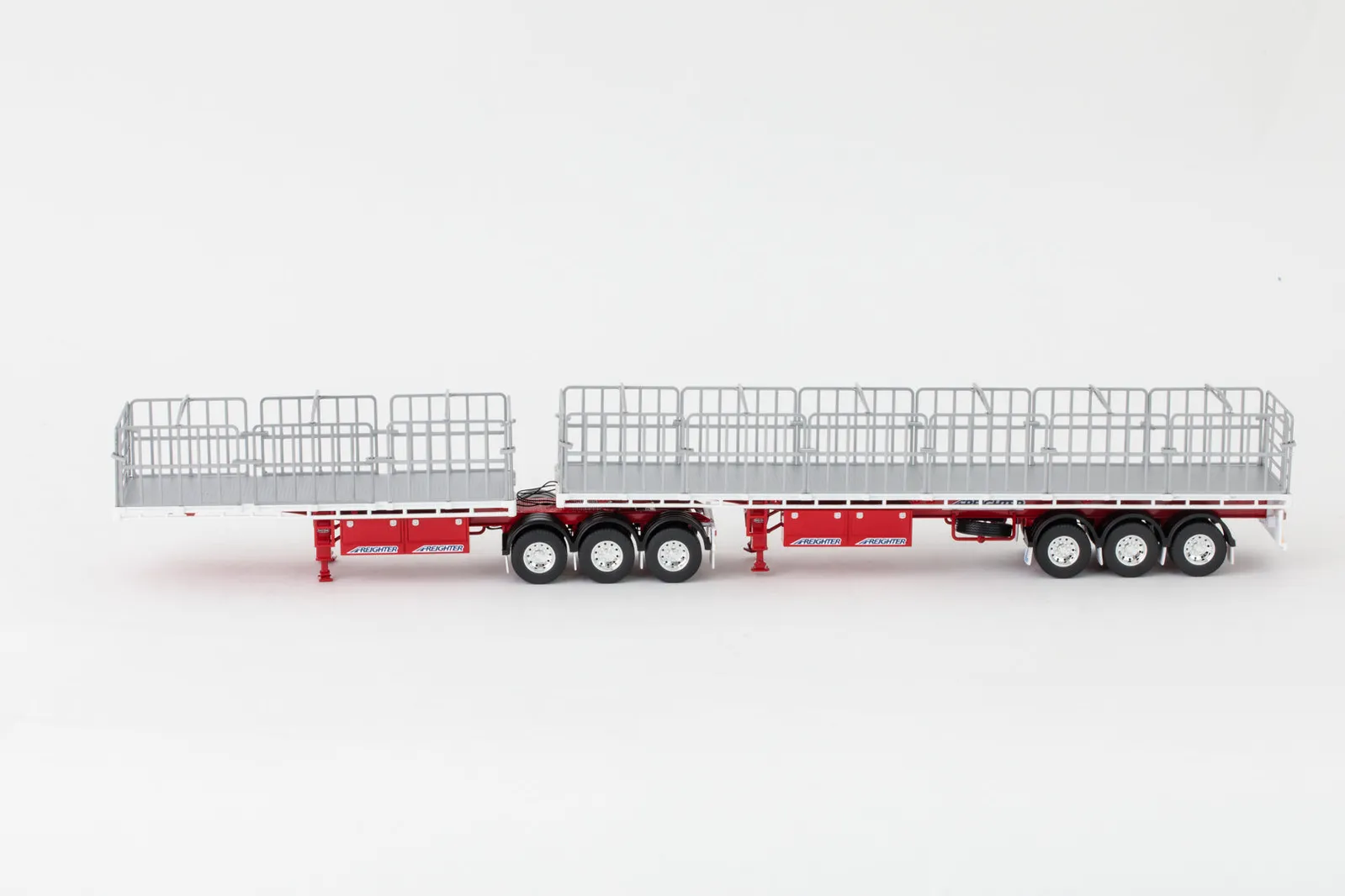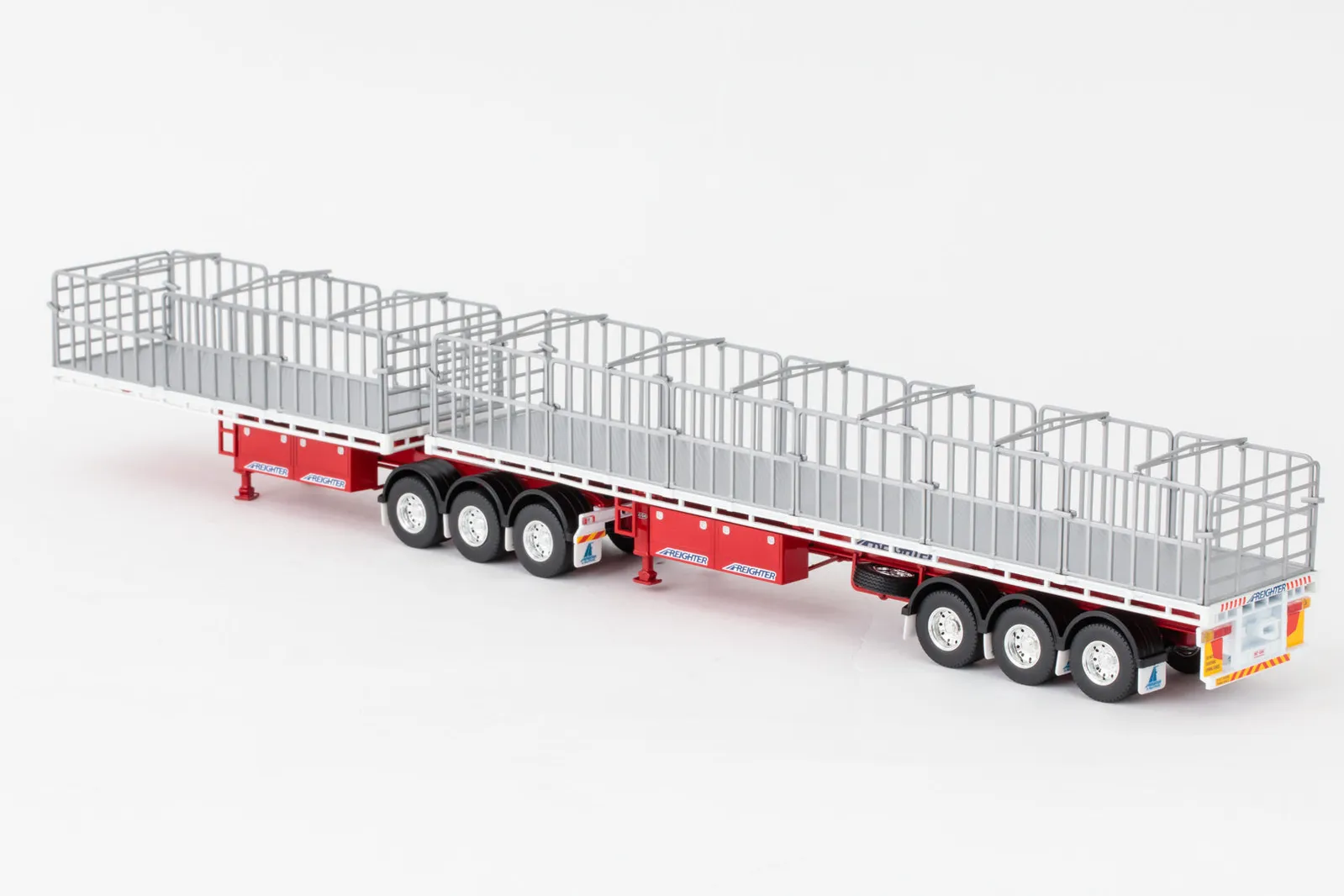 Scale: 1:50 - Make/Model : Freighter B Double Flat Top - Colour: White/Red - Features: - Removable Steel Gates and Bows - Replicated Air Hoses - Gate Storage - Tool Boxes - Oscillating & Locking 5th Wheel - Wind Down Legs - Working Suspension - Model Dimensions - A Trailer: 220mm x 50mm x 35 mm (65mm with gates) - B Trailer: 175 mm x 50 mm x 35mm (65mm with gates) - Manufacturer: Drake Collectibles
