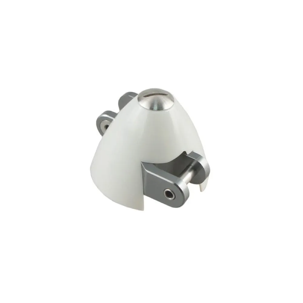 Dualsky spinner assembly to suit folding propellors on EP gliders. Designed in the Czech Republic, this light but very strong assembly is suitable for most electric powered gliders including F5J, eRES and F5K. The tapered collet clamping cone is easy to fit and very secure. The angled, z style propeller hub allows for a very streamlined effect when the blades (we recommend Aeronaut CAM or CAM Z) fold back. Available in a number of different diameters and to suit most motor shaft sizes. It is supplied with a rubber ring of the appropriate diameter to assist the blades to fold back when the motor stops. Features - Suitable for most electric-powered gliders including F5J, eRES and F5K - Angled, z-style propeller hub - Supplied with a rubber ring Specification - Diameter: 30 mm - Motor Shaft: 5 mm - Distance across hinge pins: 25 mm - Prop hinge pin diameter: 3 mm - Prop blade root width: 8 mm - Weight: 10.6 g