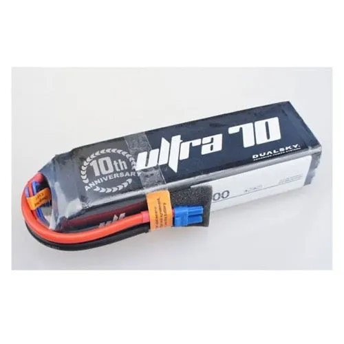 Dualsky Ultra 70 LiPo Battery, 4400mAh 2S 70c Specification - Capacity (mAh): 4400 - Voltage (V): 7.4 - Energy (Wh): 32.6 - Weight (g): 253 - Dimensions (L x W x T): 160 x 46 x 16 - Discharge (C): 70 - Max Charge (C): 12