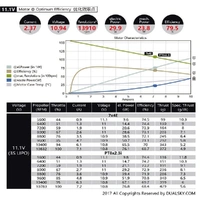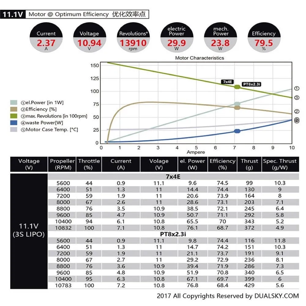 The Dualsky ECO 2 Series motors have made great improvements in many aspects. It brought a new electromagnetic design, more competitive performance and efficiency, long-time endurance and waterproof. Features - High temperature resistant - Impact resistance increased by about 10g - NMB ball bearings are durable and low noise - Motor working life significantly increased by 50% compared to V1 - Up to 500V insulation level - Rust-proof main shaft Specification - KV: 1470 - Turns: 31 - Weight: 19 g - Dimensions (D x L): 28.5 x 15.7 mm - Slots & Poles: 12N14P - Ri (mOhm): 377 - Io @ 10V: 0.3 A - No of Cells (LiPo): 2 - 3 - Max. Efficiency Current: 5 A - Max. Burst Current (15S): 8 A - Max. Power (15S): 96 W - Max. Torque [N*M]: 0.062 - Shaft Diameter: 3.175 mm - Mounting Holes Pitch: 32 - Input Connectors: GC2.0 - Recommended ESC: XC-12-LITE or XC1010BA - Propeller: - 2S: 9x4.7SF, 10x5E - 3S: 7x4E, PT8x2.3i - Class: 100-150g airplanes e.g. F3P or indoor freestyle