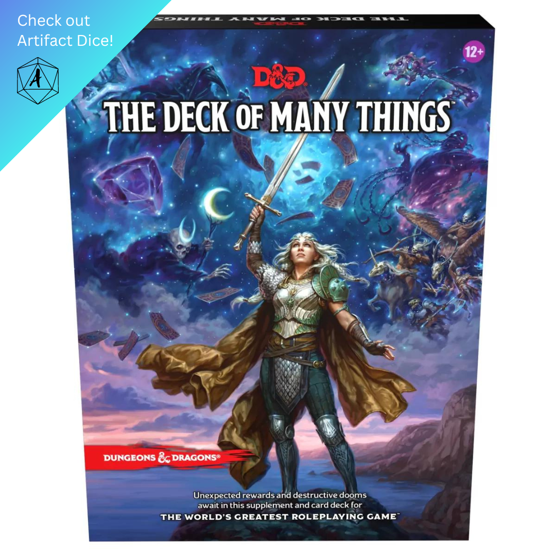 Complement with Artifact Dice ! The ultimate magic item for the world’s greatest roleplaying game. The Deck of Many Things is a famous Dungeons & Dragons magic item whose effects are as spectacular as they are unpredictable. Within this box, you’ll find The Book of Many Things , which illuminates the deck’s mysteries and provides everything Dungeon Masters need to use it in their campaigns. This book includes advice, adventure locations, and new monsters for Dungeon Masters, as well as character options, magic items, and organizations for players, all inspired by the deck. This set also includes lavishly illustrated cards for The Deck of Many things, including additional cards that triple the deck’s size, allowing you to build the perfect deck for your campaign. An accompanying guidebook shows how to use the cards as a traditional oracle deck or to create D&D adventures inspired by the cards. Contents: The Book of Many Things (192-page hardcover) —A book for players and Dungeon Masters alike with content that can be dropped into any campaign, all thematically tied to The Deck of Many Things The Deck of Many Things (66-card deck) —Own one of D&D’s most legendary magic items with a deck containing the original 22 cards with updated art, plus 44 additional cards that can be substituted to customize your play experience The Deck of Many Things Card Reference Guide (80-page hardcover) —Deck guide booklet showcasing each card in the expanded deck and a variety of ways the deck can be used Deck Box —Sturdy custom box to store your deck and deck reference guide