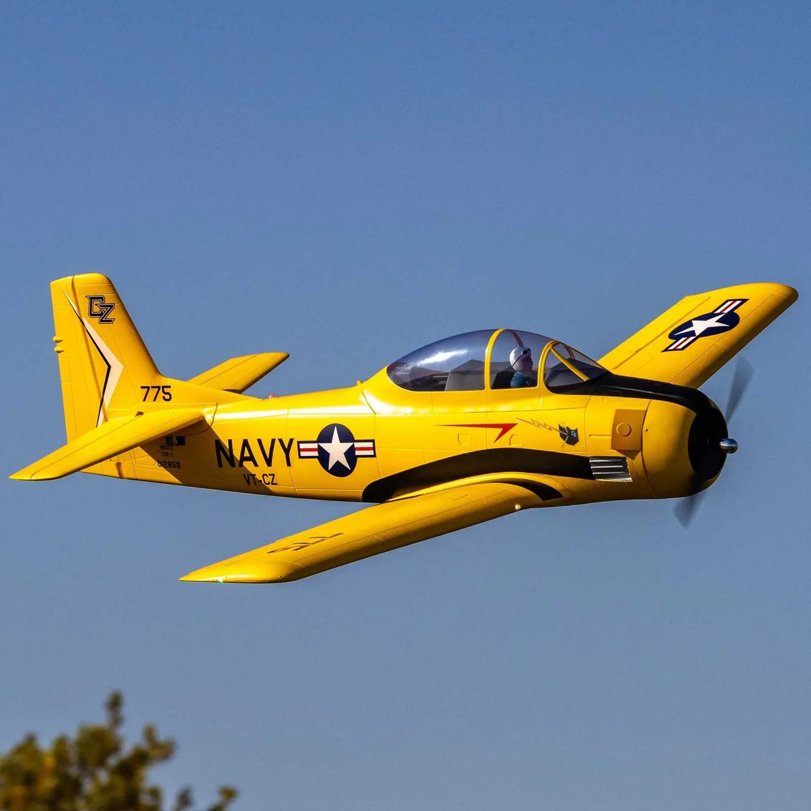 The E-flite® Carbon-Z T-28 Trojan 2.0m has been updated and upgraded to be the Smartest and easiest-to-fly large-scale model of the ever-popular T-28 yet! Featuring functional flaps plus more durable and reliable retracts, it's the perfect first "giant scale" warbird for a wide variety of pilots. The power system has been upgraded with a Spektrum Avian Smart Lite 70A ESC, and the BNF® Basic version is equipped with an AR637TA receiver to deliver full-range, real-time telemetry data along with Spektrum AS3X® and SAFE® Select technologies. The airframe is now fully painted in a vibrant yellow finish, and additional decals are included so you can customize and personalize the scheme. Exclusive Carbon-Z construction allows a foam airplane as large as this to be rigid like a conventional all-wood airframe, yet lightweight so it can have unmatched handling and flight performance. Plus, the durability of the EPO material means it can easily handle any bumps along the way while being easy to repair if needed! Numerous scale details include a cockpit with a simulated instrument panel and pilot figure, a cowl fitted with a replica radial engine, and other surface details. And it's now equipped with LED navigation and landing lights to enhance your scale experience, especially when flying in the early morning and late evening hours!