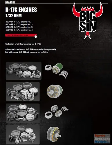 Free Shipping For Orders Over $150 To Metro Areas* (Online orders only)Description Brassin collection of all four engines for B-17G in 1/32 scale. All sets included in this BIG SIN are available separately, but with every BIG SIN set you save up to 30%.
