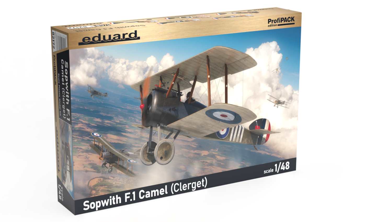 ProfiPACK edition kit of British WWI fighter aircraft Sopwith F.1 Camel with Clerget rotary engine in 1/48 scale. - Plastic parts: Eduard - Marking options: 5 - Decals: Eduard - PE parts: yes, pre-painted - Painting mask: yes - Resin parts: no