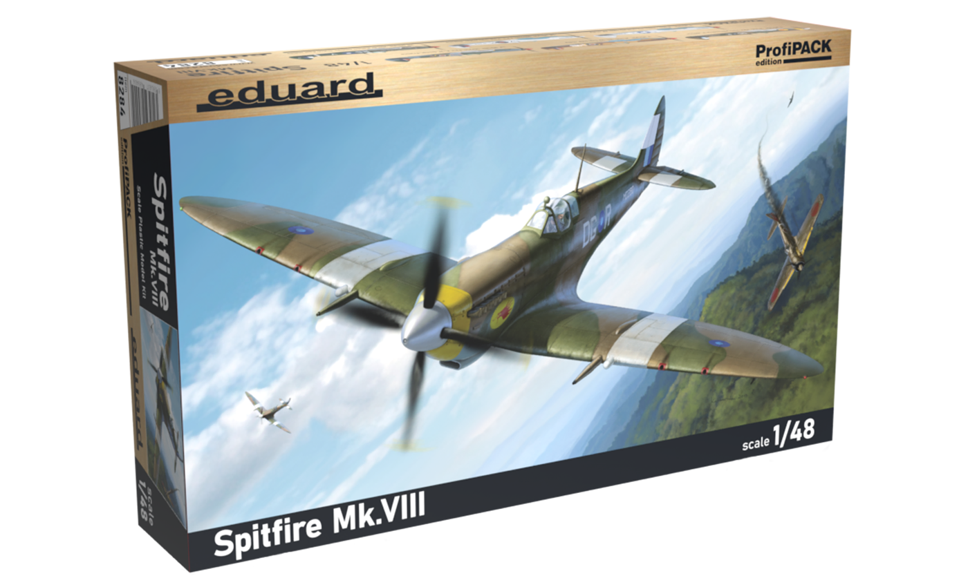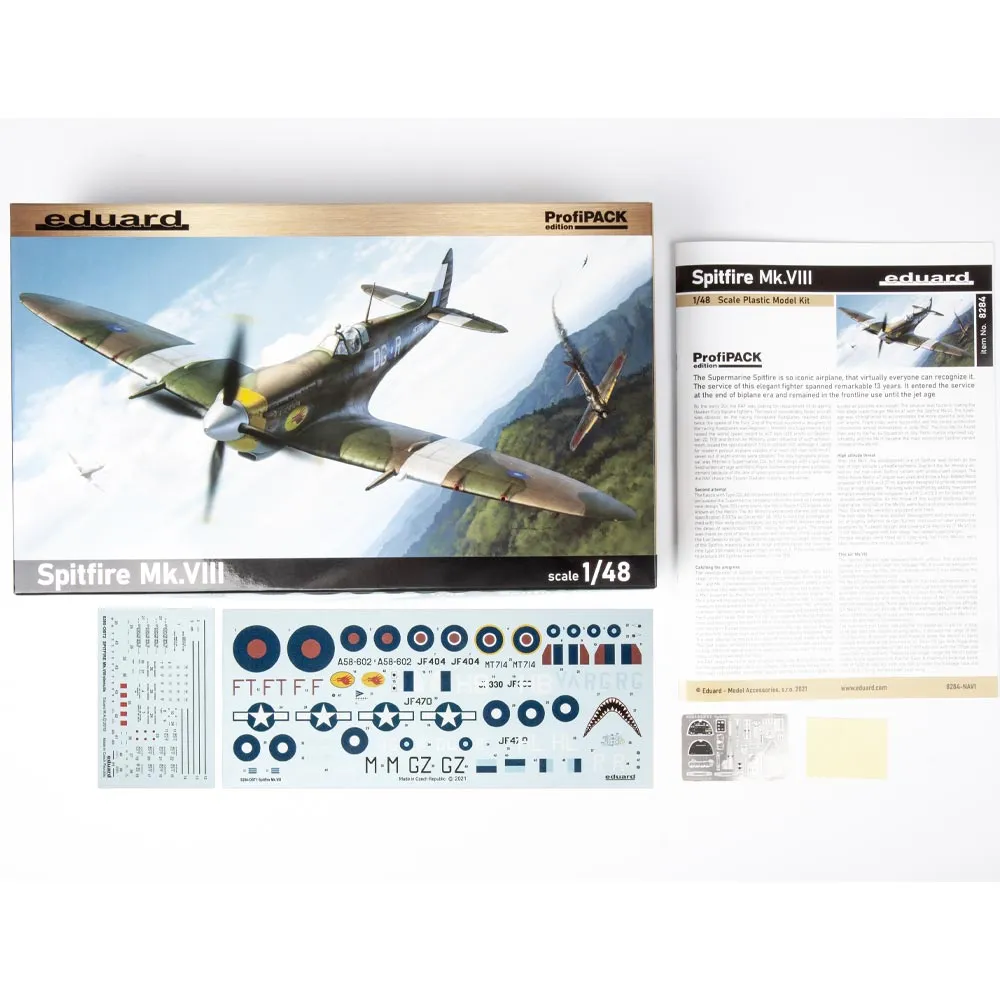Profipack edition kit of British WWII fighter aircraft Spitfre Mk.VIII in 1/48 scale. - Plastic parts: Eduard - No. of decal options: 6 - Decals: Eduard - PE parts: Yes, pre-painted - Painting mask: Yes - Resin parts: No To assemble this plastic model kit you will need the paints and glues. Our favorites are the Tamiya Glues . We also recommend the Mr. Hobby and Mr. Color range of paints.