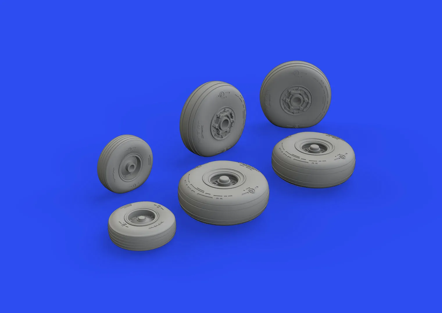 Description Brassin set - the undercarriage wheels for C-130 in 1/72 scale. The set consists of the main wheels and nose wheels.