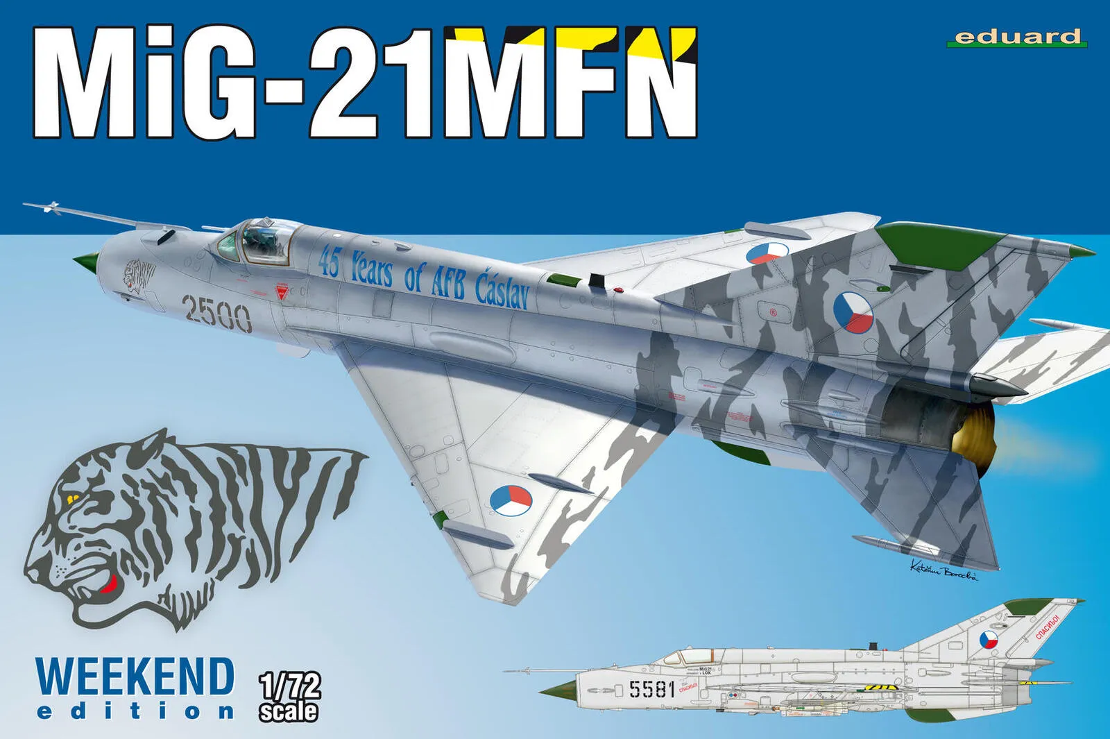 Miloyan MiG-21MFN Weekend edition kit of Czech jet aircraft MiG-21MFN in 1/72 scale. - plastic parts: Eduard - No. of marking options: 2 - decals: Eduard - PE parts: yes, - painting mask:no, - resin parts: yes, antennas