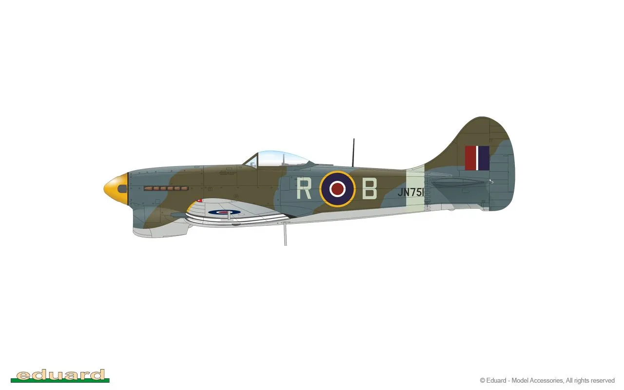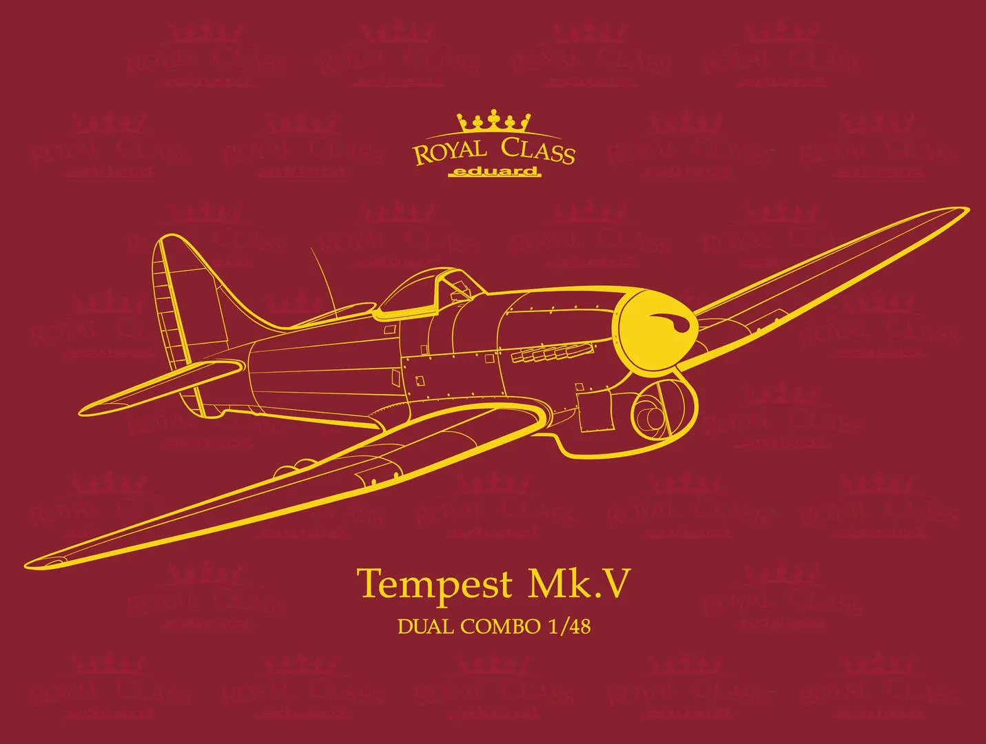 Royal Class edition kit of British WWII fighter aircraft Tempest Mk.V in 1/48 scale. plastic parts: Eduard No. of decal options: 14 decals: Cartograf PE parts: yes, pre-painted, painting mask: yes, resin parts: yes, undercarriage wheels, exhaust stacks, the cable cutter/shock absorber for TT.5 version extra: a pictorial book that covers Tempest Mk.V service