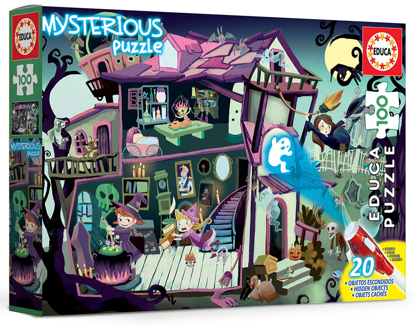 Assemble the puzzle and find the hidden objects with the ultraviolet light torch. You can also draw your own mysterious objects using the invisible ink pen. Content: 100 piece puzzle, invisible ink pen with UV light, sheet with images of the hidden elements. Approximate size of the assembled puzzle: 40 x 28 cm.