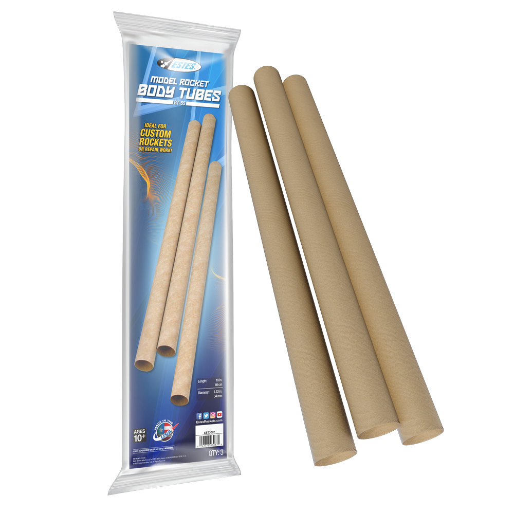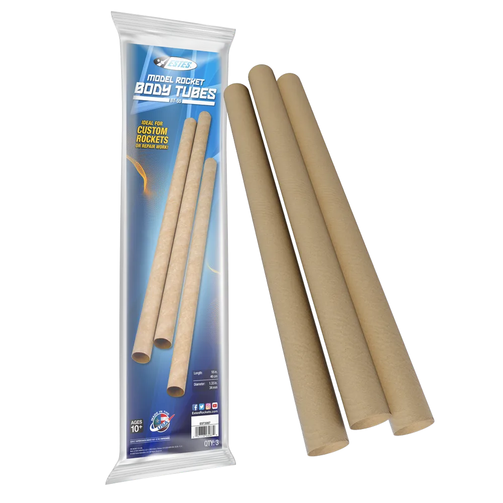 High Quality Construction: Durable spiral wound paper tube built for strength and smooth finishing Perfect Fit: Designed for rockets that use BT-55 body tubes and compatible with NC-55 nose cones Expandable Design: Use tube couplers to connect multiple BT-55 tubes of the same diameter Three Pack Value: Includes three BT-55 body tubes per package for multiple builds or repairs
