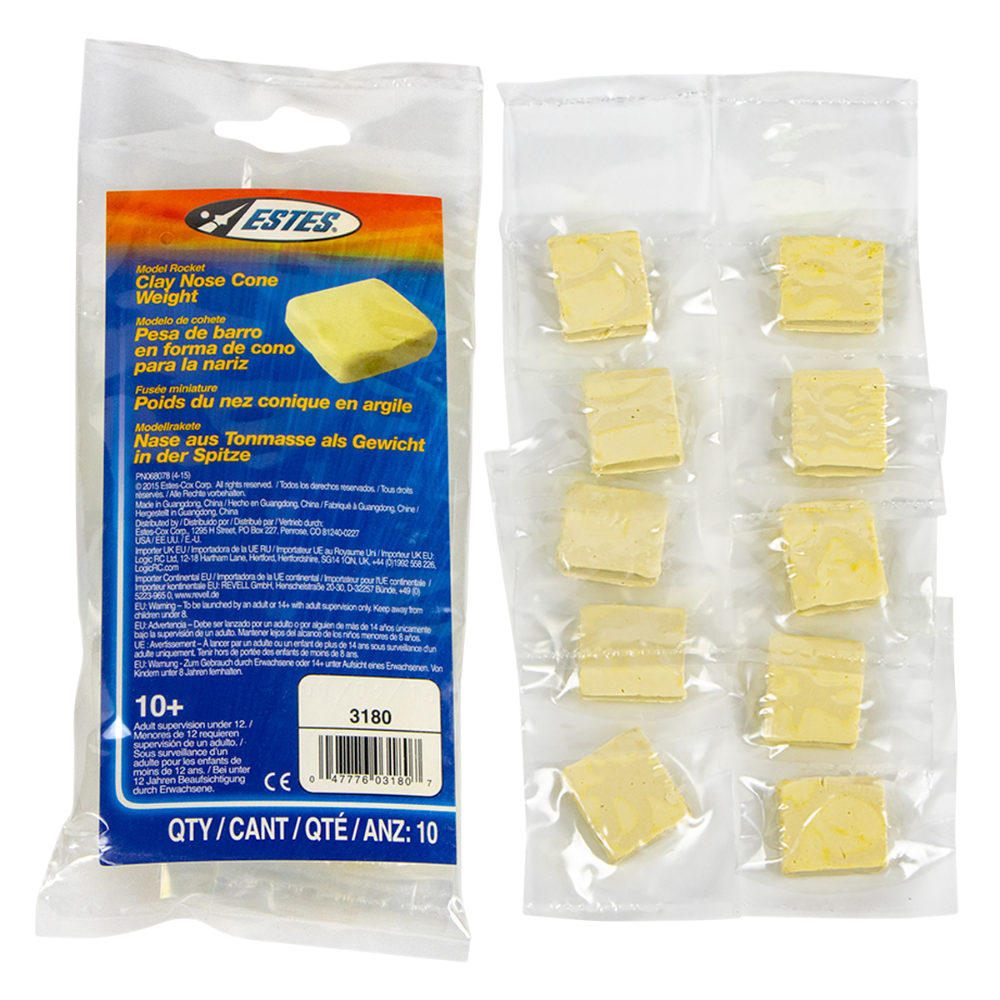 Includes 10 squares of clay. Each square weight approximately .25 ounces. Perfect for when you additional weight in the nose cone!