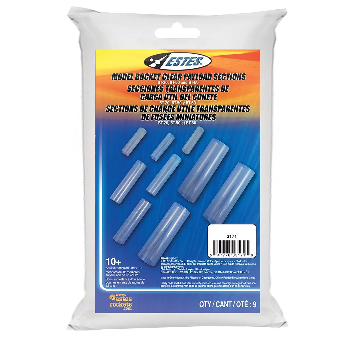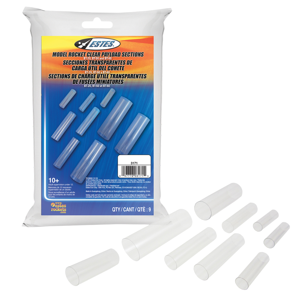 Three sizes included: BT-20, BT-50, and BT-60 payload sections Total of nine sections: Three of each size for versatile use Transparent design: Watch your experiments during flight Compatible with Estes body tubes: Easily integrate into your rocket builds Great for STEM projects: Encourages hands-on learning and creativity