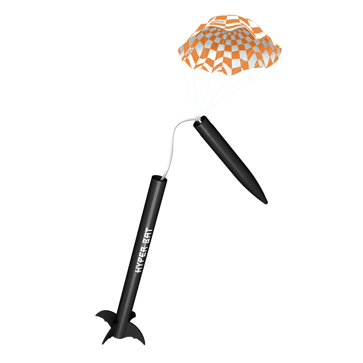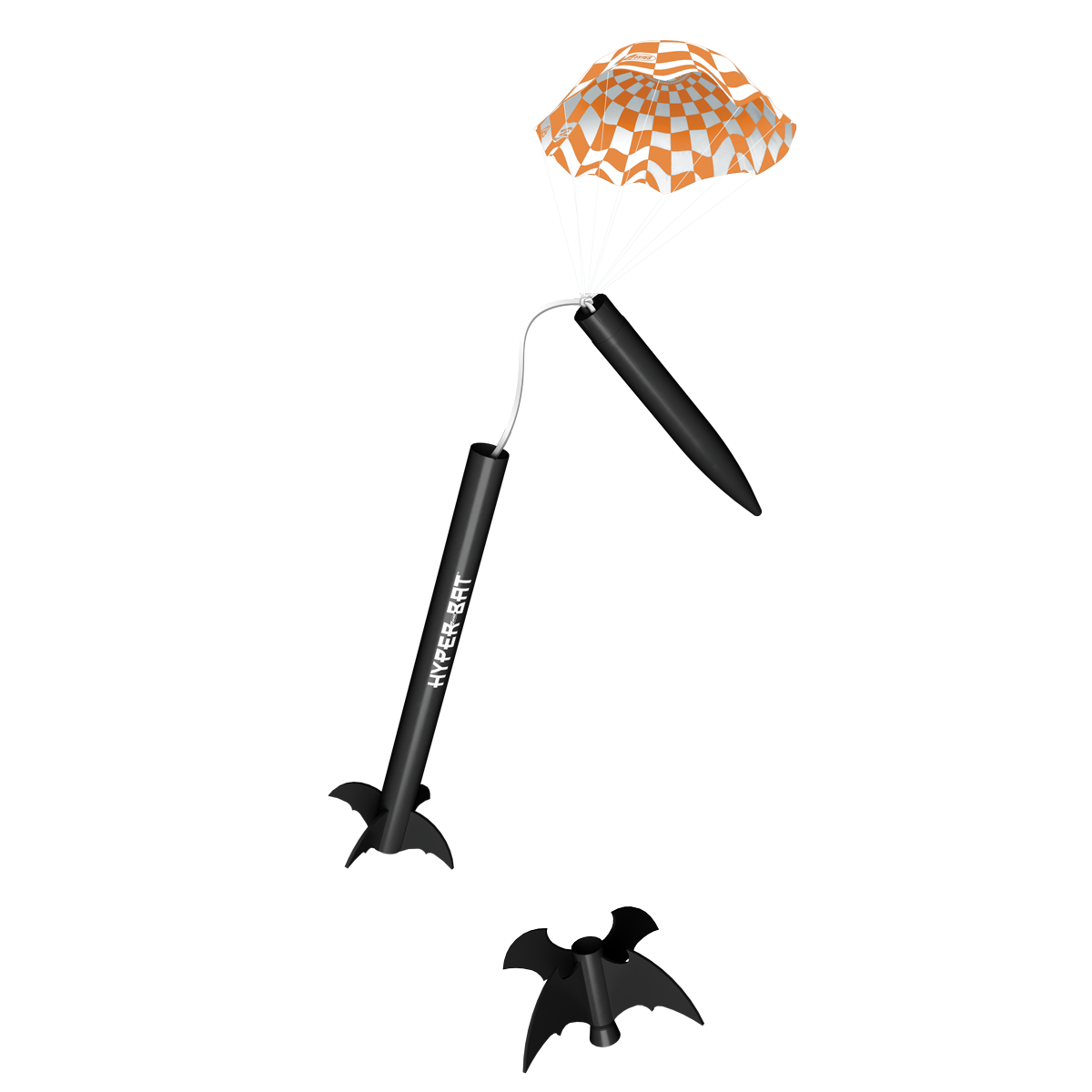 The Hyper Bat flies on standard engines and a really cool 12 inch parachute brings it back to earth. Prepare for re-launch with a new Estes engine, wadding, a starter and starter plug.